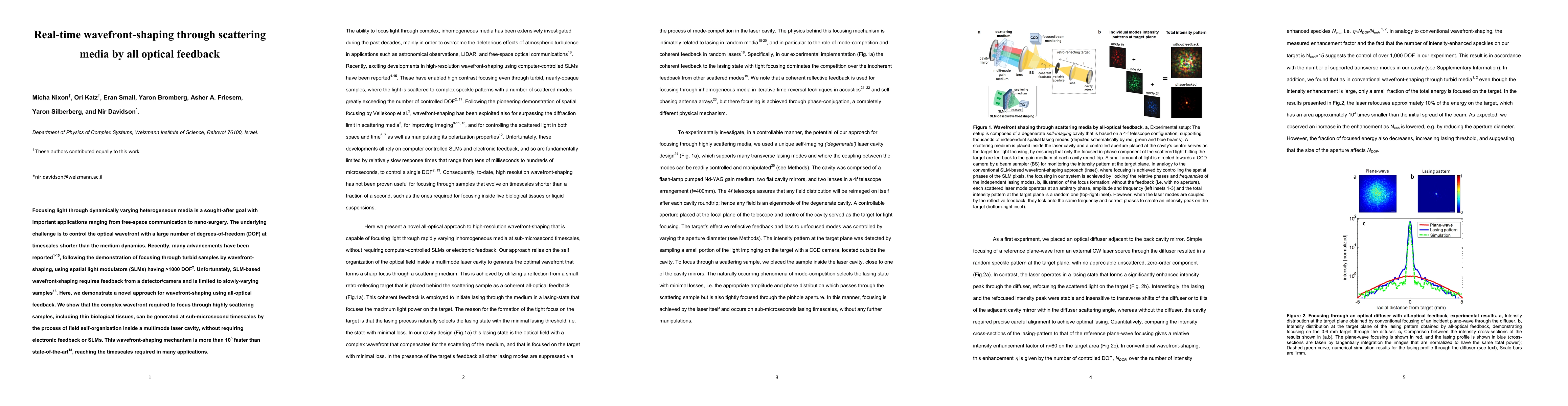 This paper presents an innovative all-optical feedback method for real-time wavefront-shaping through scattering media, enabling field self-organization inside a multimode laser cavity to focus light in sub-microsecond timescales, surpassing previous SLM-based techniques by five orders of magnitude.