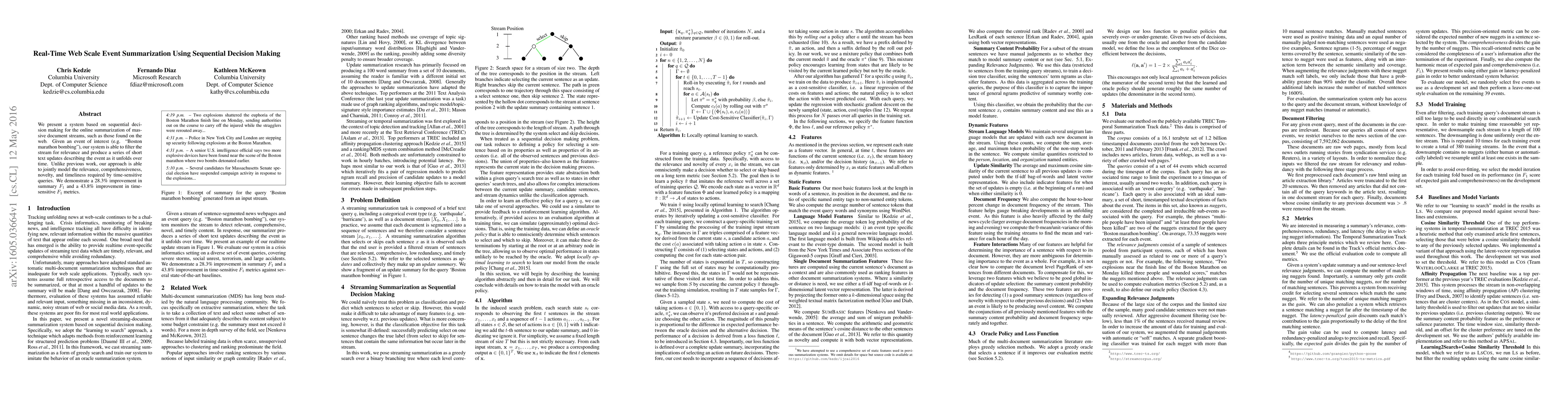 This paper introduces a system for real-time summarization of web-scale event streams using sequential decision making, achieving significant improvements in relevance and timeliness metrics. The system filters and produces short updates on events like the "Boston marathon bombing," outperforming previous methods by 28.3% in summary F1 and 43.8% in time-sensitive F1.
