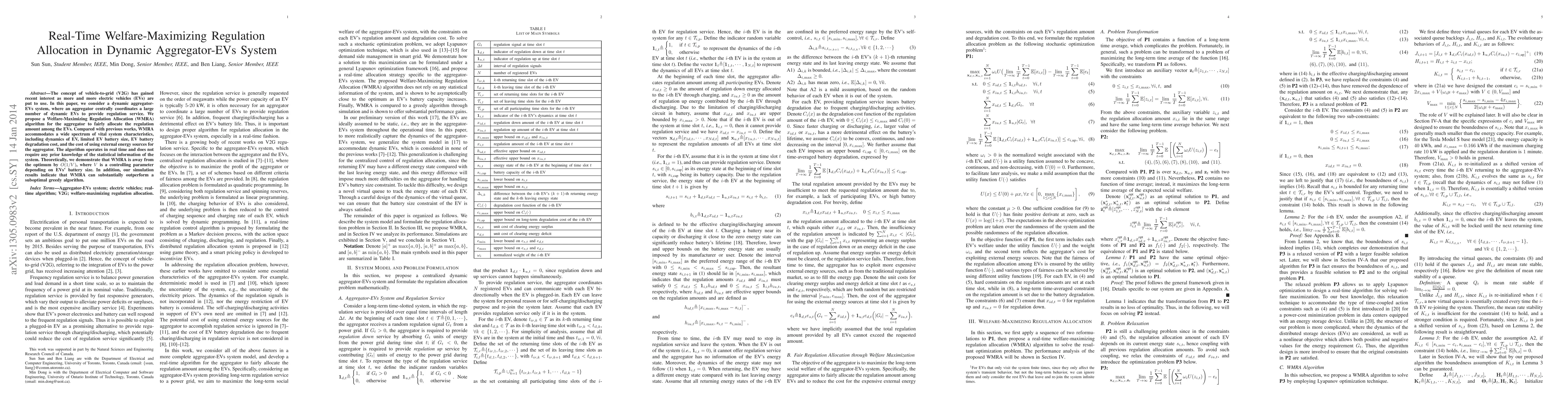 This paper proposes a Welfare-Maximizing Regulation Allocation (WMRA) algorithm for a dynamic aggregator-EVs system to fairly allocate regulation services among EVs. The algorithm considers factors like EV dynamics, battery size, and degradation costs, operating in real time without prior system knowledge, and theoretically demonstrates near-optimal performance.