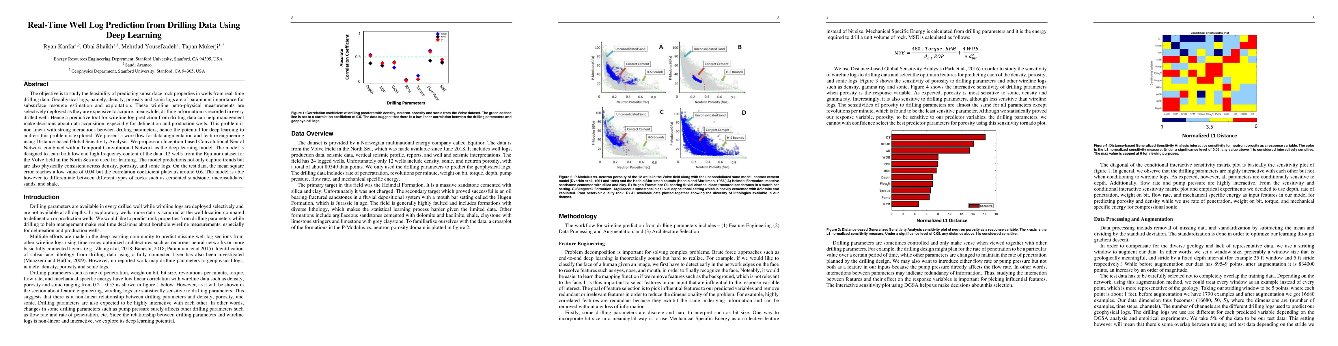 The objective is to study the feasibility of predicting subsurface rock properties in wells from real-time drilling data. Geophysical logs, namely, density, porosity and sonic logs are of paramount importance for subsurface resource estimation and exploitation. These wireline petro-physical measurements are selectively deployed as they are expensive to acquire; meanwhile, drilling information is recorded in every drilled well. Hence a predictive tool for wireline log prediction from drilling data can help management make decisions about data acquisition, especially for delineation and production wells. This problem is non-linear with strong ineractions between drilling parameters; hence the potential for deep learning to address this problem is explored. We present a workflow for data augmentation and feature engineering using Distance-based Global Sensitivity Analysis. We propose an Inception-based Convolutional Neural Network combined with a Temporal Convolutional Network as the deep learning model. The model is designed to learn both low and high frequency content of the data. 12 wells from the Equinor dataset for the Volve field in the North Sea are used for learning. The model predictions not only capture trends but are also physically consistent across density, porosity, and sonic logs. On the test data, the mean square error reaches a low value of 0.04 but the correlation coefficient plateaus around 0.6. The model is able however to differentiate between different types of rocks such as cemented sandstone, unconsolidated sands, and shale.