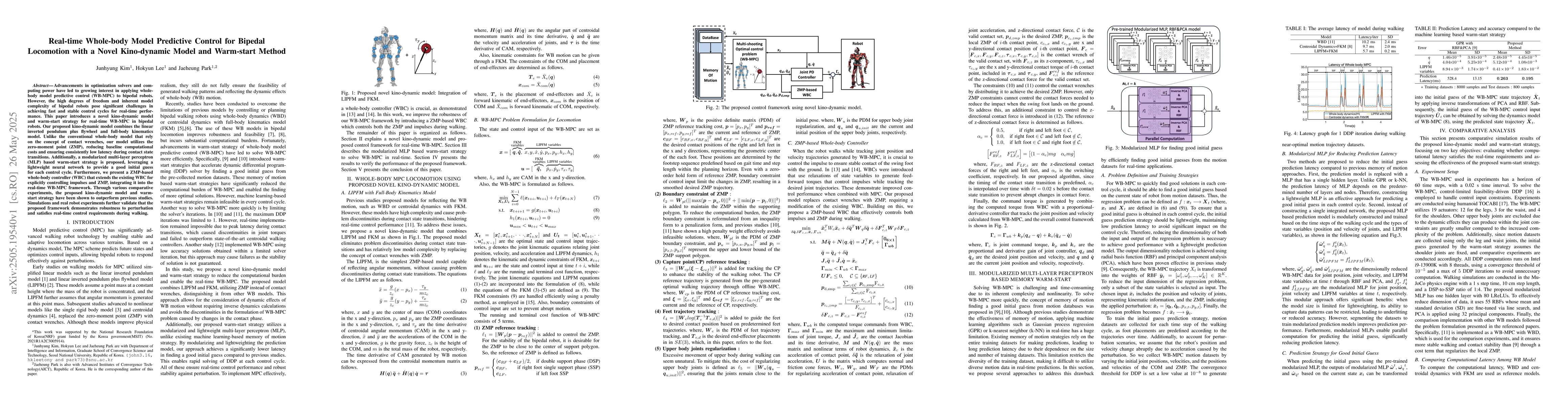 The research introduces a novel kino-dynamic model combining linear inverted pendulum plus flywheel and full-body kinematics, alongside a modularized multi-layer perceptron (MLP) based warm-start strategy for real-time whole-body model predictive control (WB-MPC) in bipedal robots.