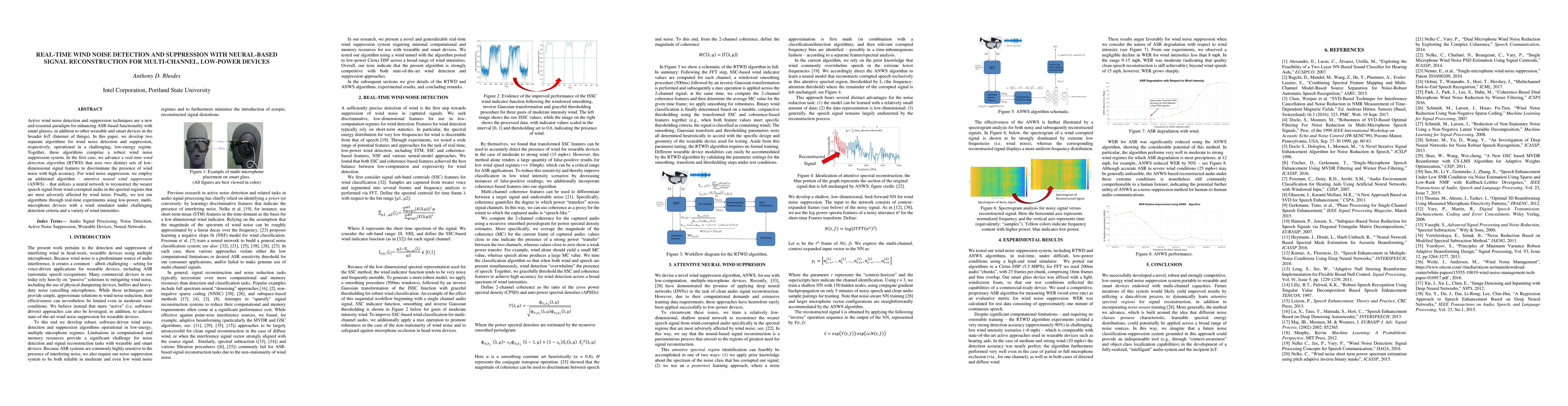 This paper presents algorithms for real-time wind noise detection and suppression in low-power, multi-channel devices, enhancing ASR functionality. It introduces a real-time wind detection algorithm (RTWD) and an attentive neural wind suppression (ANWS) system for effective noise reduction.