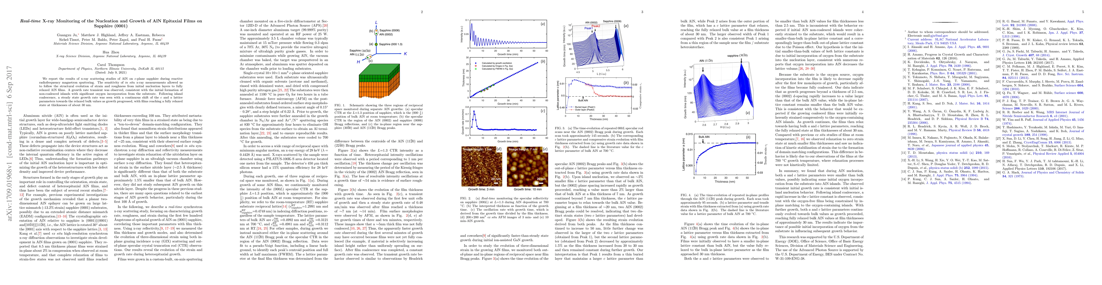 This study uses in situ x-ray scattering to monitor the nucleation and growth of AlN films on sapphire during sputtering, revealing a transient growth rate and significant oxygen incorporation initially, followed by island coalescence and gradual relaxation towards bulk lattice parameters.