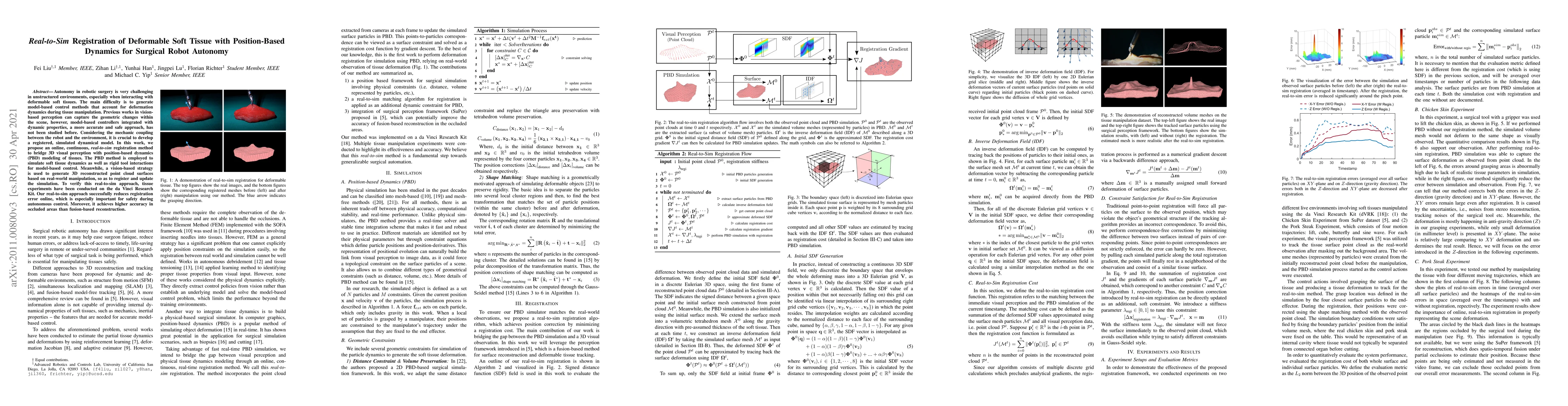 This paper proposes a real-to-sim registration method that combines 3D visual perception with position-based dynamics modeling to improve autonomy in robotic surgery, reducing registration error and achieving higher accuracy in occluded areas.