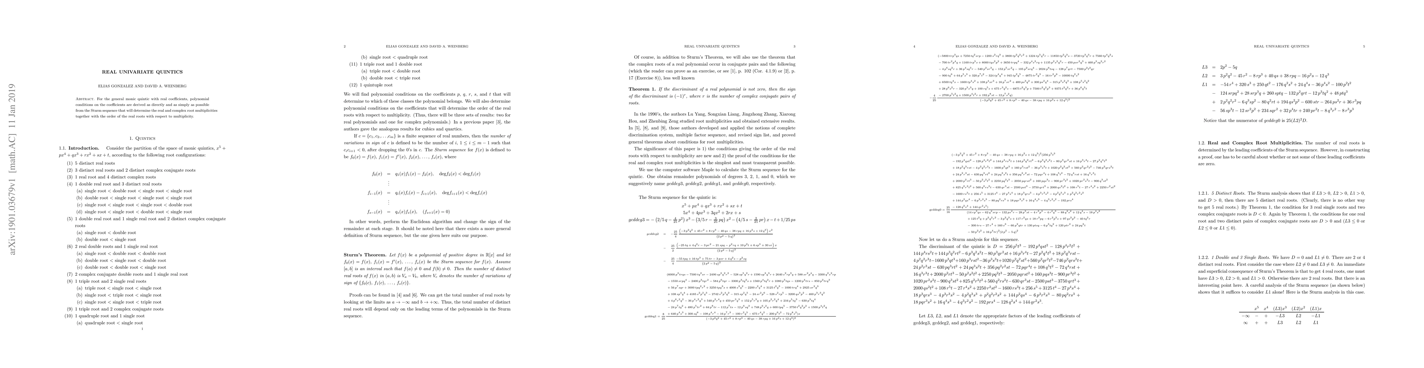 For the general monic quintic with real coefficients, polynomial conditions on the coefficients are derived as directly and as simply as possible from the Sturm sequence that will determine the real and complex root multiplicities together with the order of the real roots with respect to multiplicity.