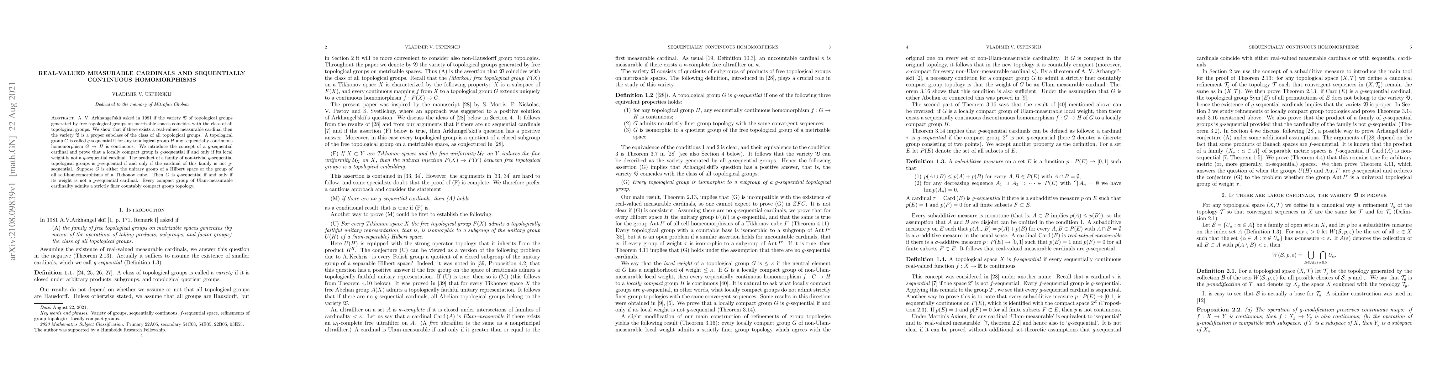 This research explores the relationship between real-valued measurable cardinals and sequentially continuous homomorphisms in topological groups. It's shown that if a real-valued measurable cardinal exists, the variety of free topological groups on metrizable spaces is a proper subset of all topological groups. The concept of a $g$-sequential cardinal is introduced, proving that locally compact groups are $g$-sequential if their local weight isn't such a cardinal. The product of non-trivial $g$-sequential groups is $g$-sequential only if the family's cardinality isn't $g$-sequential. Notably, certain group types like unitary groups or homeomorphism groups of Tikhonov cubes are $g$-sequential if their weight isn't a $g$-sequential cardinal. Compact Ulam-measurable cardinality groups can have a strictly finer countably compact topology.