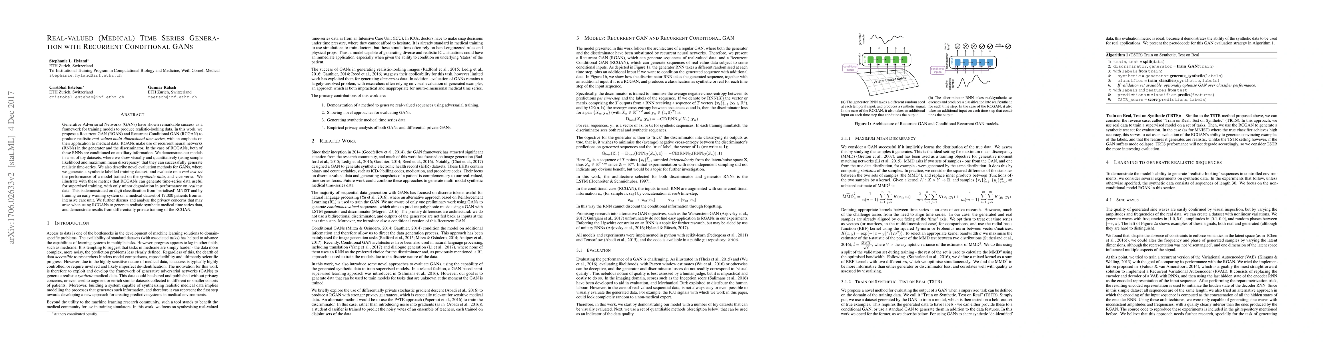 This paper proposes Recurrent Conditional GANs (RCGANs) to generate realistic real-valued multi-dimensional time series, particularly for medical data applications. The models demonstrate successful generation of synthetic time-series data that can be used for supervised training, with minimal performance degradation on real test data.