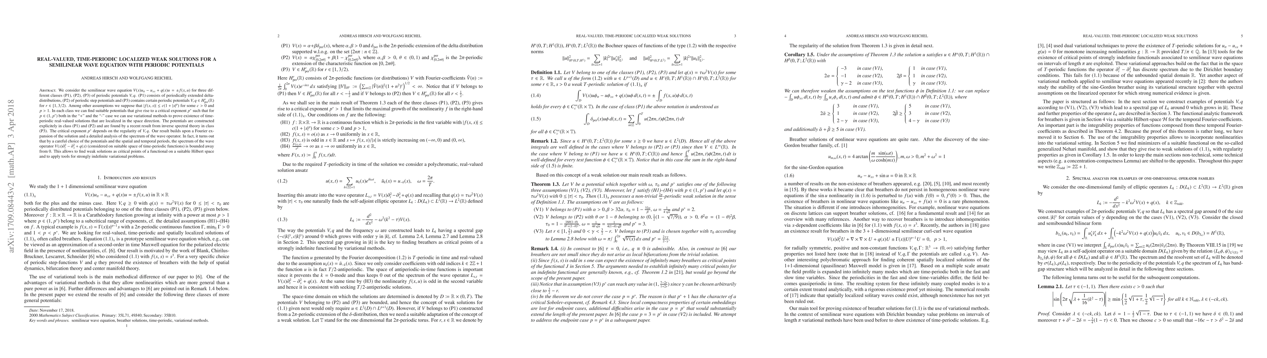 This research identifies conditions for the existence of real-valued, time-periodic solutions to a semilinear wave equation with periodic potentials. It proves such solutions exist for three potential classes using variational methods, explicit constructions, and inverse spectral theory. The findings hinge on a bounded spectrum of the wave operator, enabling application of tools for indefinite variational problems.