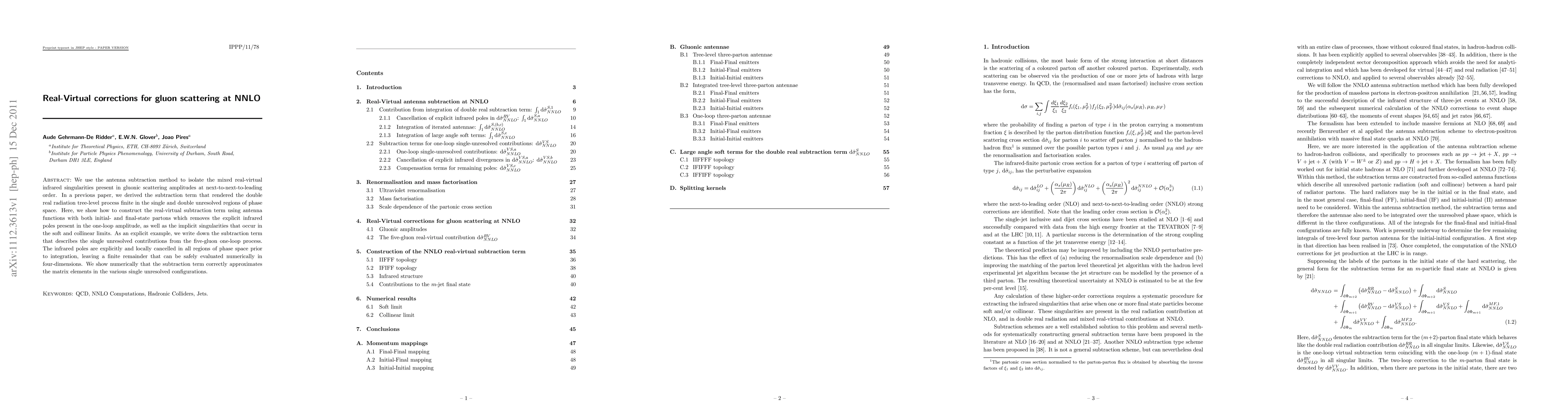 This paper develops an antenna subtraction method to isolate and cancel infrared singularities in gluon scattering amplitudes at next-to-next-to-leading order, ensuring finiteness in both real and virtual contributions. The method effectively removes explicit infrared poles and implicit singularities, allowing for safe numerical evaluation.