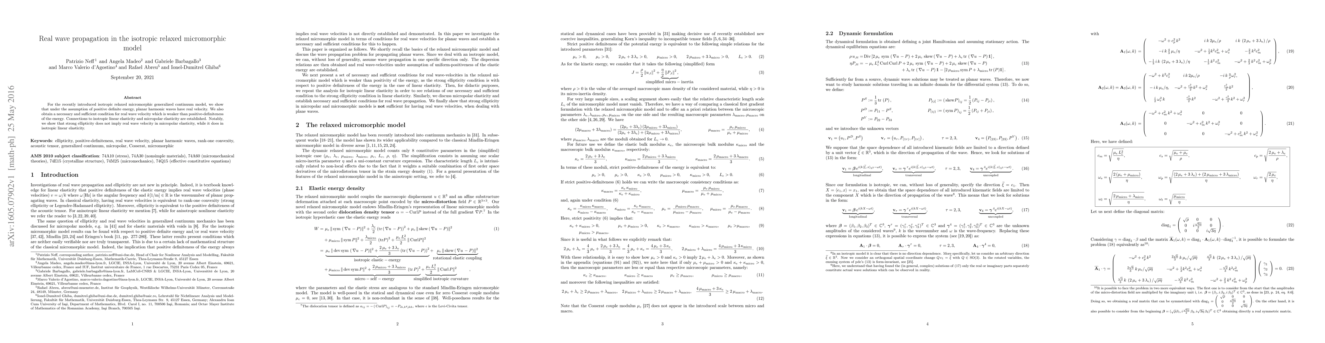 This paper demonstrates that planar harmonic waves in the isotropic relaxed micromorphic model exhibit real wave velocities under positive definite energy conditions. It also provides a weaker, necessary and sufficient condition for real wave velocity and compares the model to isotropic linear and micropolar elasticity, highlighting differences in wave velocity implications.