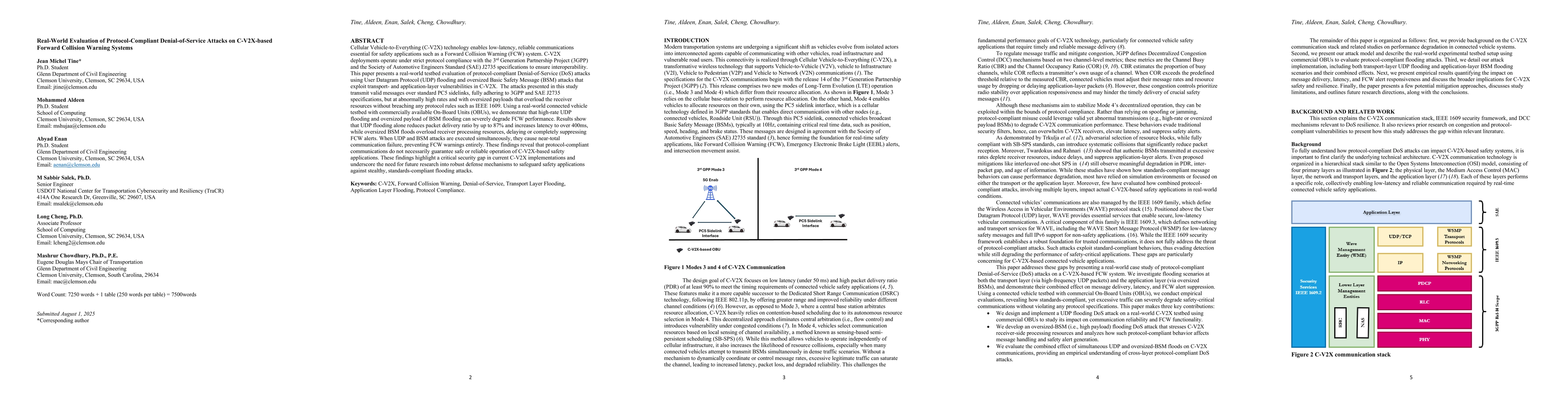 Cellular Vehicle-to-Everything (C-V2X) technology enables low-latency, reliable communications essential for safety applications such as a Forward Collision Warning (FCW) system. C-V2X deployments operate under strict protocol compliance with the 3rd Generation Partnership Project (3GPP) and the Society of Automotive Engineers Standard (SAE) J2735 specifications to ensure interoperability. This paper presents a real-world testbed evaluation of protocol-compliant Denial-of-Service (DoS) attacks using User Datagram Protocol (UDP) flooding and oversized Basic Safety Message (BSM) attacks that 7 exploit transport- and application-layer vulnerabilities in C-V2X. The attacks presented in this study transmit valid messages over standard PC5 sidelinks, fully adhering to 3GPP and SAE J2735 specifications, but at abnormally high rates and with oversized payloads that overload the receiver resources without breaching any protocol rules such as IEEE 1609. Using a real-world connected vehicle 11 testbed with commercially available On-Board Units (OBUs), we demonstrate that high-rate UDP flooding and oversized payload of BSM flooding can severely degrade FCW performance. Results show that UDP flooding alone reduces packet delivery ratio by up to 87% and increases latency to over 400ms, while oversized BSM floods overload receiver processing resources, delaying or completely suppressing FCW alerts. When UDP and BSM attacks are executed simultaneously, they cause near-total communication failure, preventing FCW warnings entirely. These findings reveal that protocol-compliant communications do not necessarily guarantee safe or reliable operation of C-V2X-based safety applications.