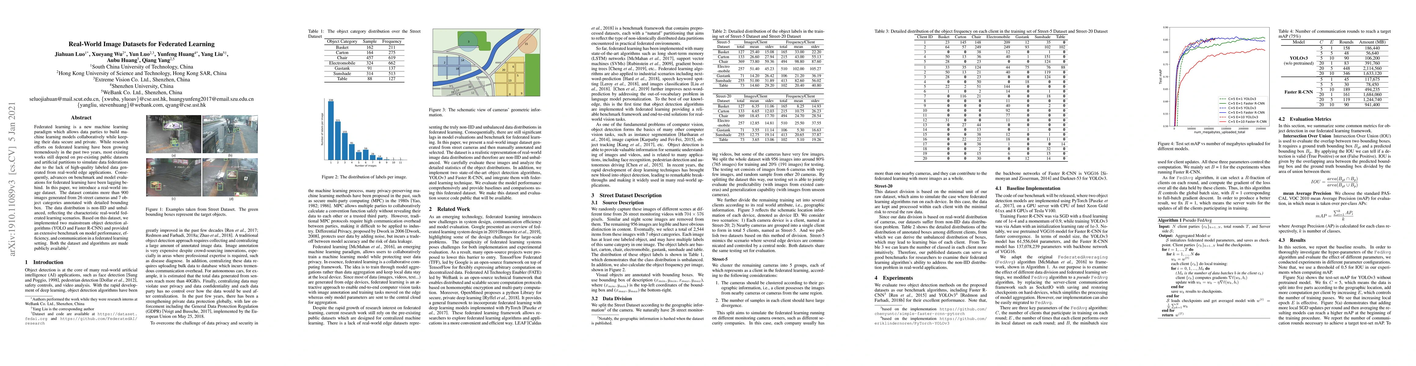 This paper introduces a real-world image dataset for federated learning, featuring over 900 images from 26 street cameras and 7 object categories. The dataset's non-IID and unbalanced distribution mirrors real-world scenarios, and it enables benchmarking of object detection algorithms like YOLO and Faster R-CNN in federated settings.