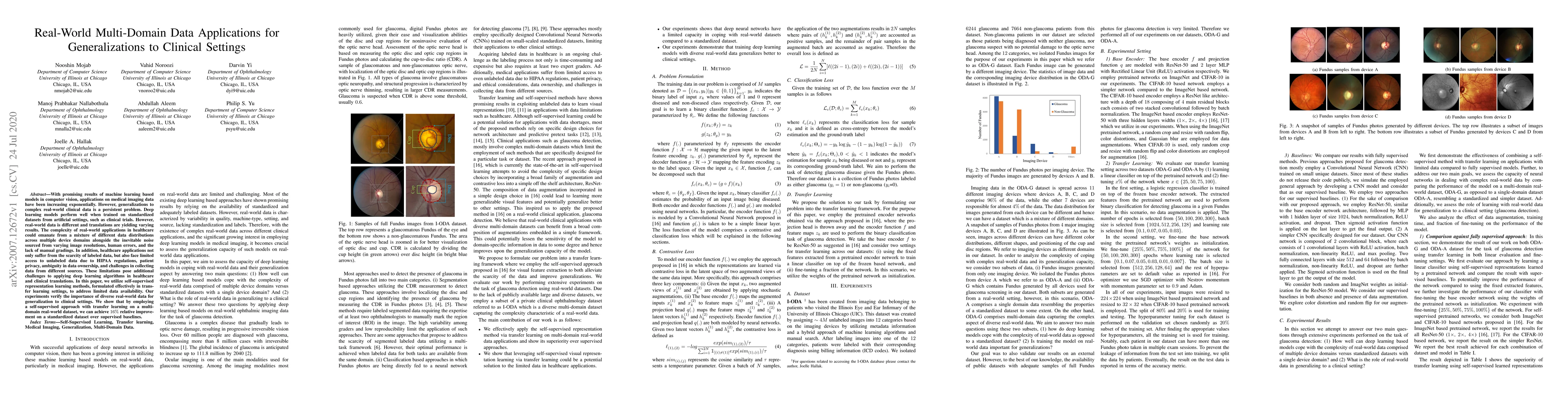 With promising results of machine learning based models in computer vision, applications on medical imaging data have been increasing exponentially. However, generalizations to complex real-world clinical data is a persistent problem. Deep learning models perform well when trained on standardized datasets from artificial settings, such as clinical trials. However, real-world data is different and translations are yielding varying results. The complexity of real-world applications in healthcare could emanate from a mixture of different data distributions across multiple device domains alongside the inevitable noise sourced from varying image resolutions, human errors, and the lack of manual gradings. In addition, healthcare applications not only suffer from the scarcity of labeled data, but also face limited access to unlabeled data due to HIPAA regulations, patient privacy, ambiguity in data ownership, and challenges in collecting data from different sources. These limitations pose additional challenges to applying deep learning algorithms in healthcare and clinical translations. In this paper, we utilize self-supervised representation learning methods, formulated effectively in transfer learning settings, to address limited data availability. Our experiments verify the importance of diverse real-world data for generalization to clinical settings. We show that by employing a self-supervised approach with transfer learning on a multi-domain real-world dataset, we can achieve 16% relative improvement on a standardized dataset over supervised baselines.