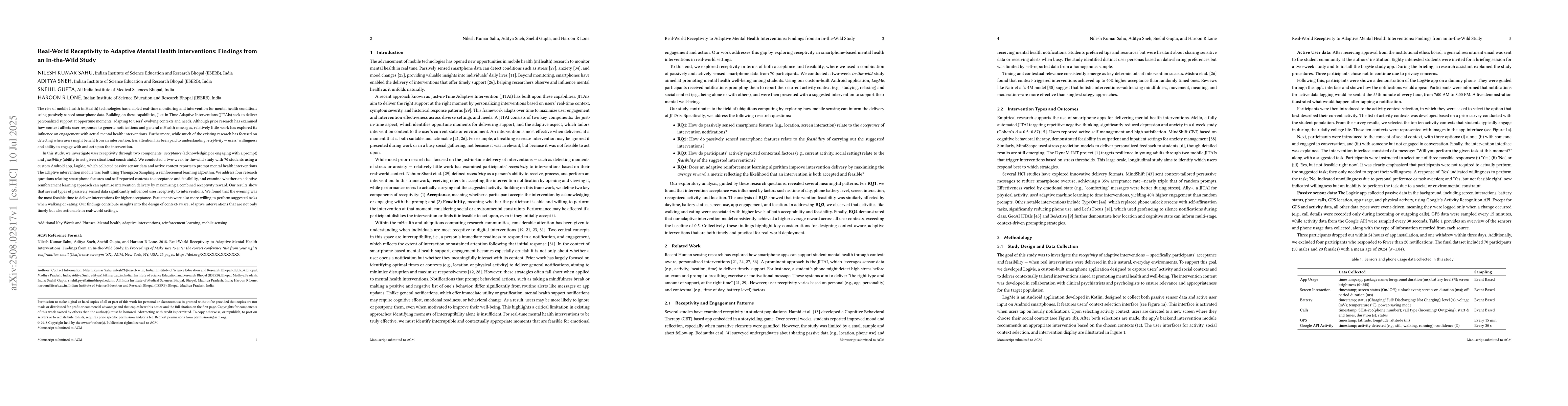 The rise of mobile health (mHealth) technologies has enabled real-time monitoring and intervention for mental health conditions using passively sensed smartphone data. Building on these capabilities, Just-in-Time Adaptive Interventions (JITAIs) seek to deliver personalized support at opportune moments, adapting to users' evolving contexts and needs. Although prior research has examined how context affects user responses to generic notifications and general mHealth messages, relatively little work has explored its influence on engagement with actual mental health interventions. Furthermore, while much of the existing research has focused on detecting when users might benefit from an intervention, less attention has been paid to understanding receptivity, i.e., users' willingness and ability to engage with and act upon the intervention. In this study, we investigate user receptivity through two components: acceptance(acknowledging or engaging with a prompt) and feasibility (ability to act given situational constraints). We conducted a two-week in-the-wild study with 70 students using a custom Android app, LogMe, which collected passive sensor data and active context reports to prompt mental health interventions. The adaptive intervention module was built using Thompson Sampling, a reinforcement learning algorithm. We address four research questions relating smartphone features and self-reported contexts to acceptance and feasibility, and examine whether an adaptive reinforcement learning approach can optimize intervention delivery by maximizing a combined receptivity reward. Our results show that several types of passively sensed data significantly influenced user receptivity to interventions. Our findings contribute insights into the design of context-aware, adaptive interventions that are not only timely but also actionable in real-world settings.