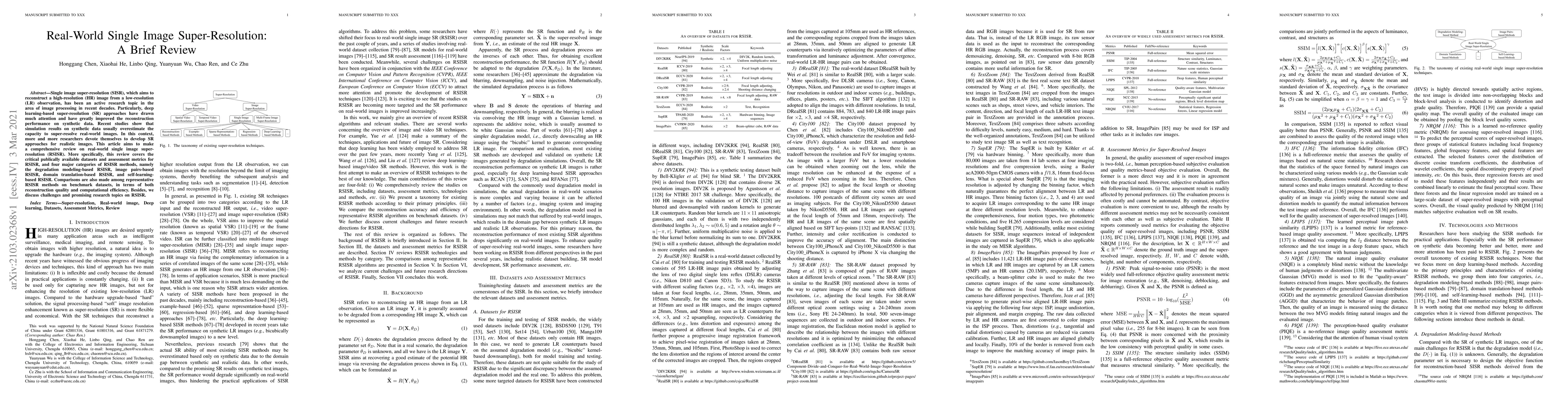 This paper provides a comprehensive review of real-world single image super-resolution (RSISR), focusing on publicly available datasets, assessment metrics, and four major method categories: degradation modeling, image pairs, domain translation, and self-learning. It compares representative RSISR methods on benchmark datasets and discusses challenges and future research directions.