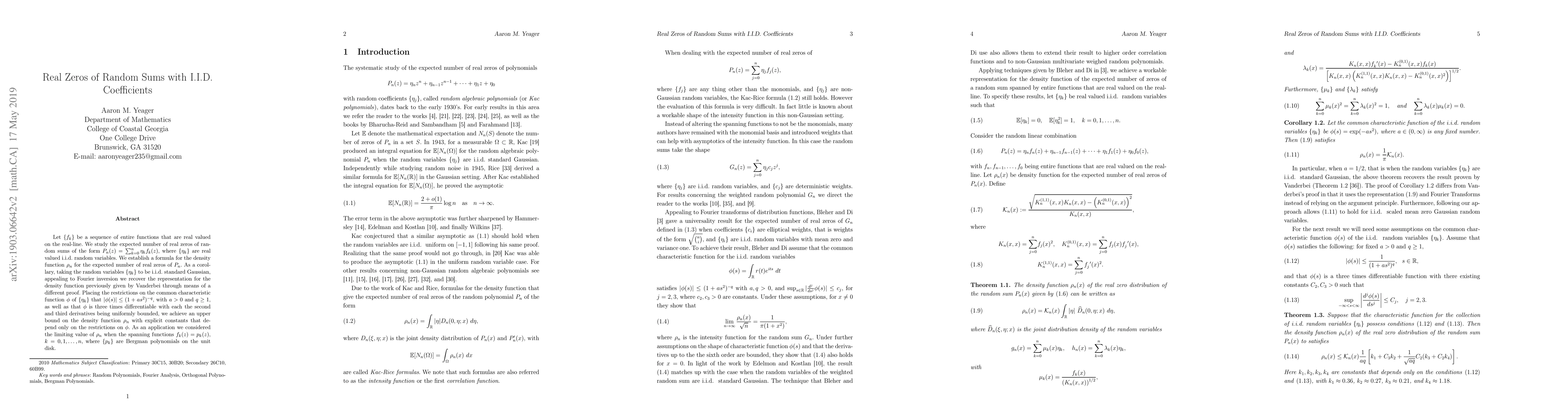 This research paper studies the expected number of real zeros of random sums formed from entire functions with i.i.d. coefficients, establishing a formula for the density function and providing bounds under certain restrictions on the common characteristic function.