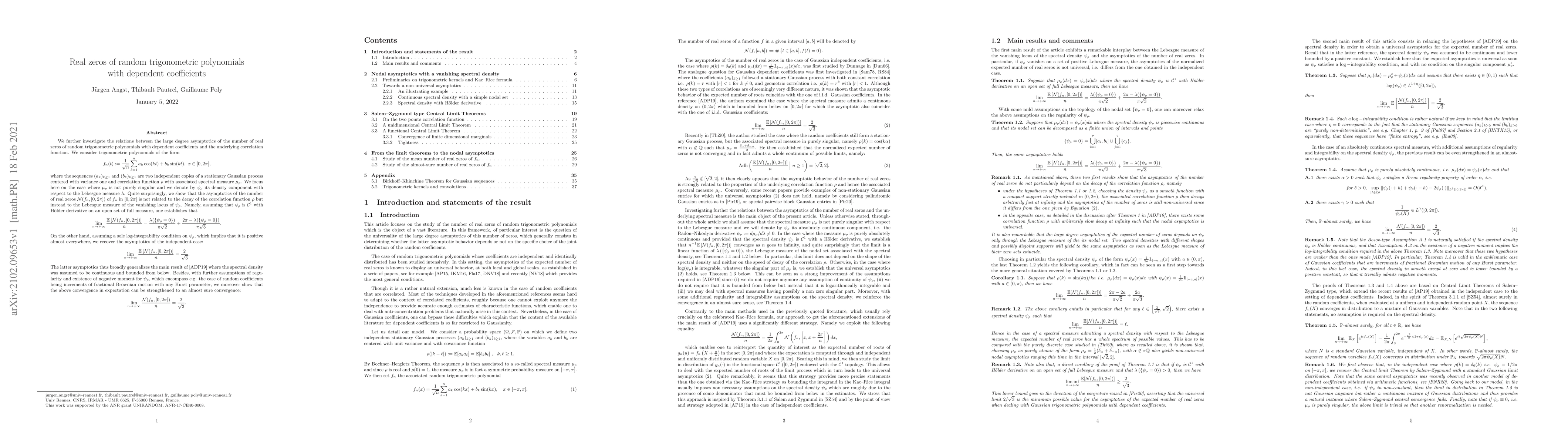 This paper investigates the asymptotic behavior of the number of real zeros of random trigonometric polynomials with dependent coefficients, showing that the number is determined by the Lebesgue measure of the vanishing locus of the density of the correlation function rather than the decay rate of the correlation function itself. The results reveal different asymptotic limits depending on the regularity of the density function.