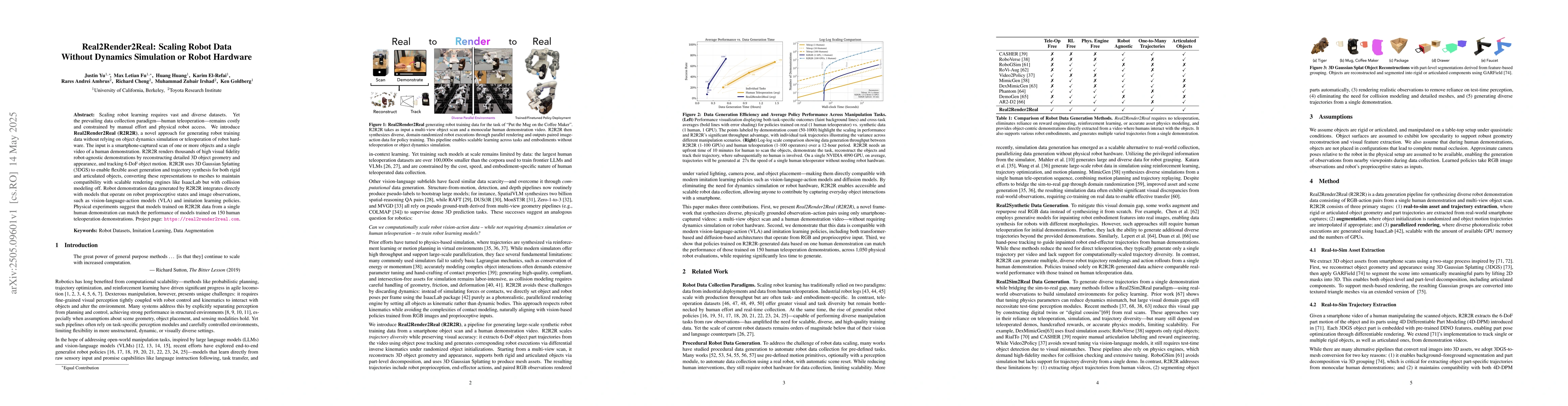 Researchers developed Real2Render2Real (R2R2R), a method to generate robot training data without physical robots or dynamics simulation, using only smartphone scans and human demonstrations.