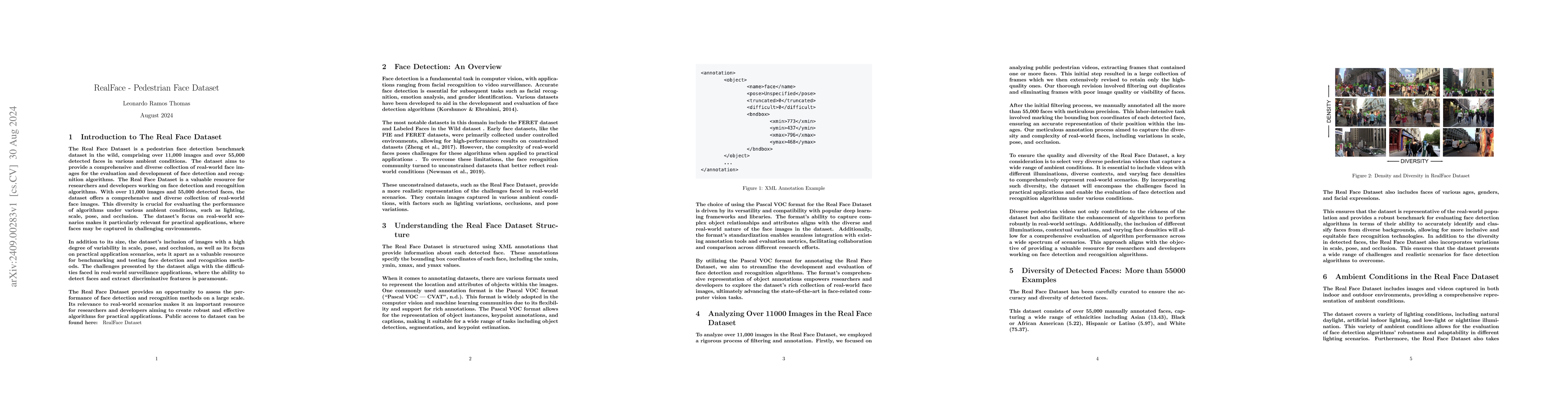 The Real Face Dataset is a pedestrian face detection benchmark dataset in the wild, comprising over 11,000 images and over 55,000 detected faces in various ambient conditions. The dataset aims to provide a comprehensive and diverse collection of real-world face images for the evaluation and development of face detection and recognition algorithms. The Real Face Dataset is a valuable resource for researchers and developers working on face detection and recognition algorithms. With over 11,000 images and 55,000 detected faces, the dataset offers a comprehensive and diverse collection of real-world face images. This diversity is crucial for evaluating the performance of algorithms under various ambient conditions, such as lighting, scale, pose, and occlusion. The dataset's focus on real-world scenarios makes it particularly relevant for practical applications, where faces may be captured in challenging environments. In addition to its size, the dataset's inclusion of images with a high degree of variability in scale, pose, and occlusion, as well as its focus on practical application scenarios, sets it apart as a valuable resource for benchmarking and testing face detection and recognition methods. The challenges presented by the dataset align with the difficulties faced in real-world surveillance applications, where the ability to detect faces and extract discriminative features is paramount. The Real Face Dataset provides an opportunity to assess the performance of face detection and recognition methods on a large scale. Its relevance to real-world scenarios makes it an important resource for researchers and developers aiming to create robust and effective algorithms for practical applications.