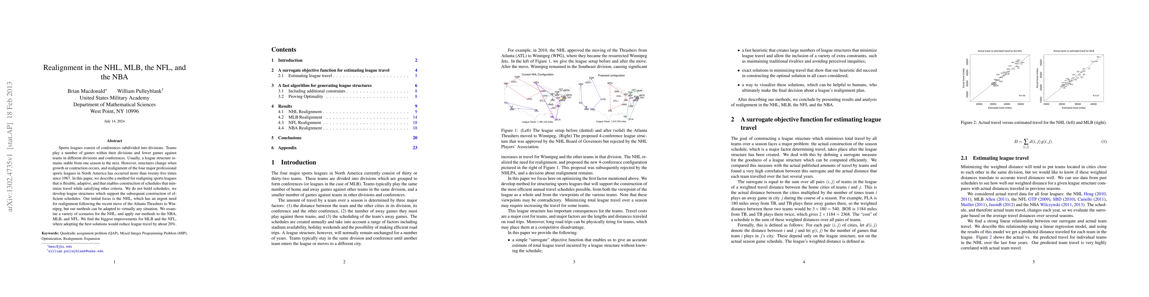 Sports leagues consist of conferences subdivided into divisions. Teams play a number of games within their divisions and fewer games against teams in different divisions and conferences. Usually, a league structure remains stable from one season to the next. However, structures change when growth or contraction occurs, and realignment of the four major professional sports leagues in North America has occurred more than twenty-five times since 1967. In this paper, we describe a method for realigning sports leagues that is flexible, adaptive, and that enables construction of schedules that minimize travel while satisfying other criteria. We do not build schedules; we develop league structures which support the subsequent construction of efficient schedules. Our initial focus is the NHL, which has an urgent need for realignment following the recent move of the Atlanta Thrashers to Winnipeg, but our methods can be adapted to virtually any situation. We examine a variety of scenarios for the NHL, and apply our methods to the NBA, MLB, and NFL. We find the biggest improvements for MLB and the NFL, where adopting the best solutions would reduce league travel by about 20%.