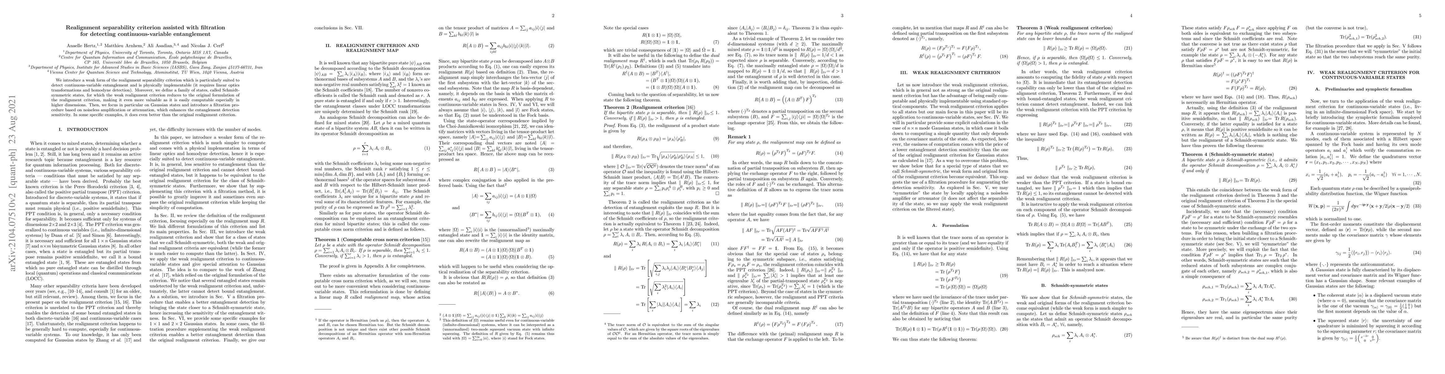 This paper proposes a weak realignment separability criterion for detecting continuous-variable entanglement, implementable via linear optics and homodyne detection. It introduces Schmidt-symmetric states where the criterion simplifies, enhancing its computational ease, and presents a filtration method based on noiseless amplification for improved sensitivity in entanglement detection.