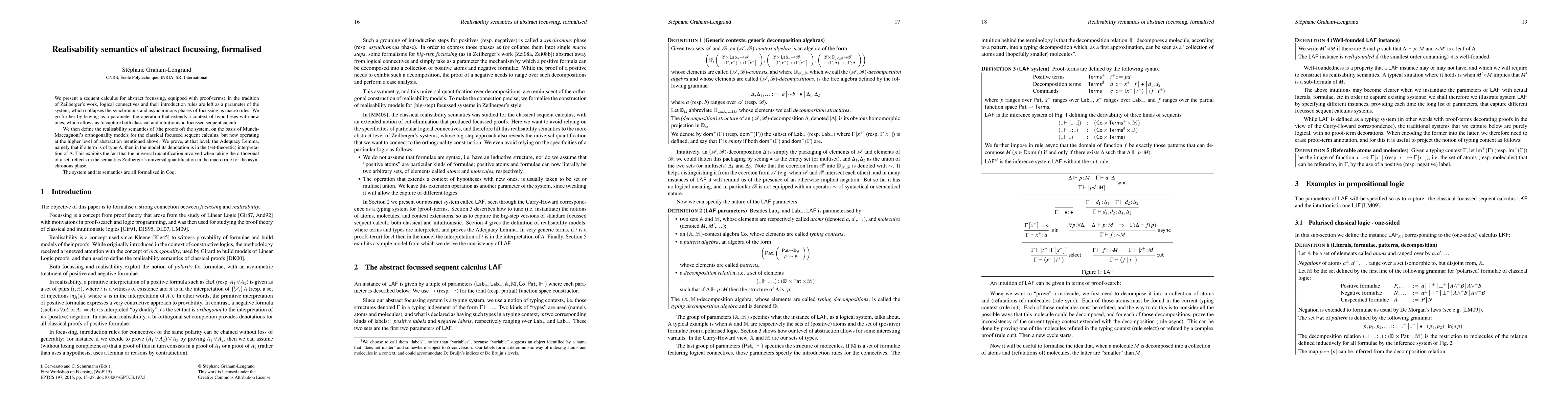 This paper introduces a sequent calculus for abstract focussing, formalised in Coq, which parameterises logical connectives and context extension operations to accommodate both classical and intuitionistic calculi. It defines a realisability semantics based on Munch-Maccagnoni's models, proving the Adequacy Lemma to establish a correspondence between proofs and their semantic interpretations.
