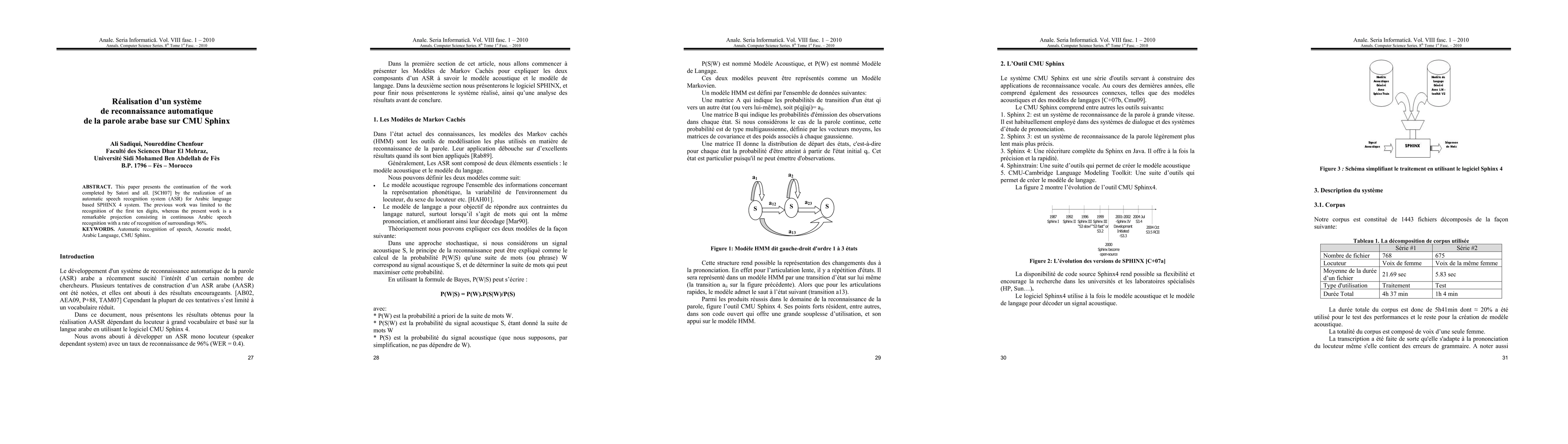 This paper presents the continuation of the work completed by Satori and all. [SCH07] by the realization of an automatic speech recognition system (ASR) for Arabic language based SPHINX 4 system. The previous work was limited to the recognition of the first ten digits, whereas the present work is a remarkable projection consisting in continuous Arabic speech recognition with a rate of recognition of surroundings 96%.