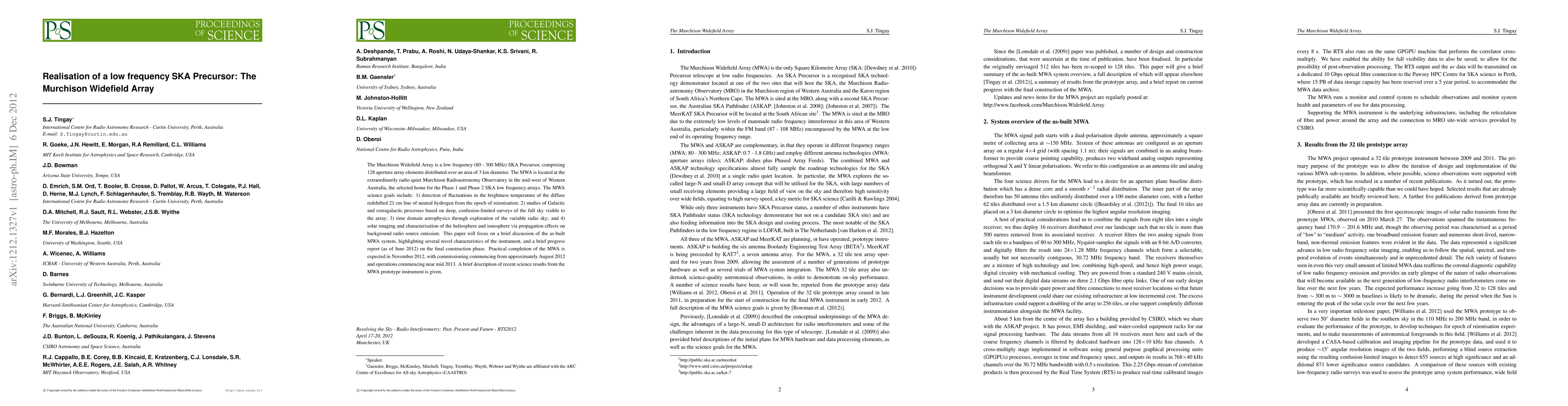 The Murchison Widefield Array (MWA) is a low-frequency precursor to the SKA, designed to operate between 80-300 MHz and located in the radio-quiet Murchison Radioastronomy Observatory in Western Australia. Its science goals include detecting redshifted 21 cm line fluctuations, conducting deep sky surveys, exploring variable radio phenomena, and studying solar and ionospheric effects. The MWA is nearing completion with operations expected to start in mid-2013.