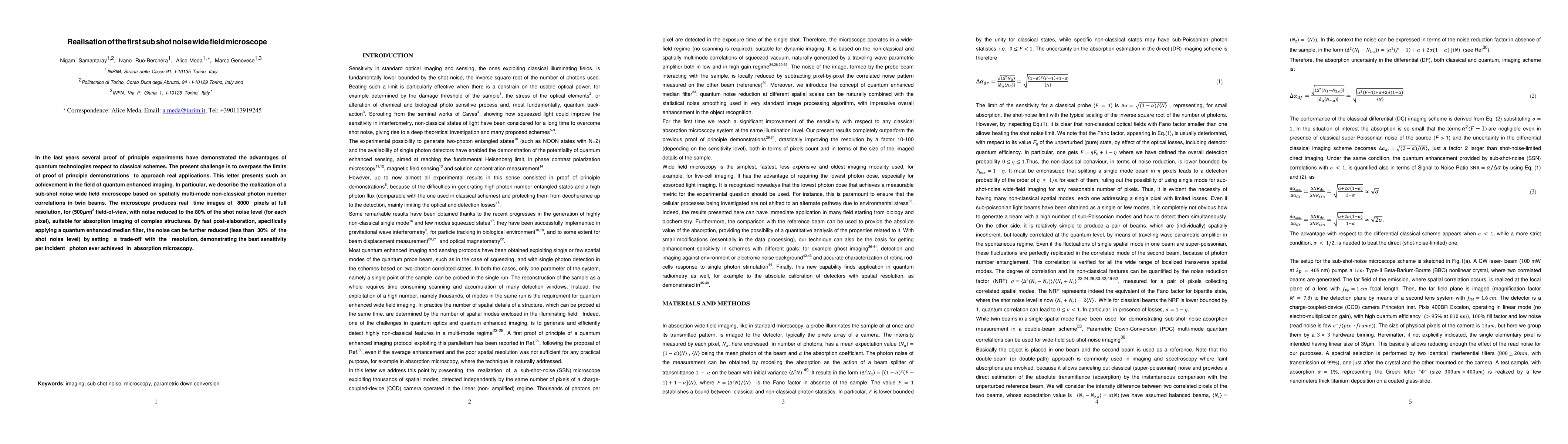 This paper reports the development of a sub-shot noise wide field microscope using twin beams and quantum enhanced imaging techniques, achieving a 80% reduction in noise level relative to shot noise for real-time imaging of complex structures, with further noise reduction to less than 30% through quantum enhanced median filtering.