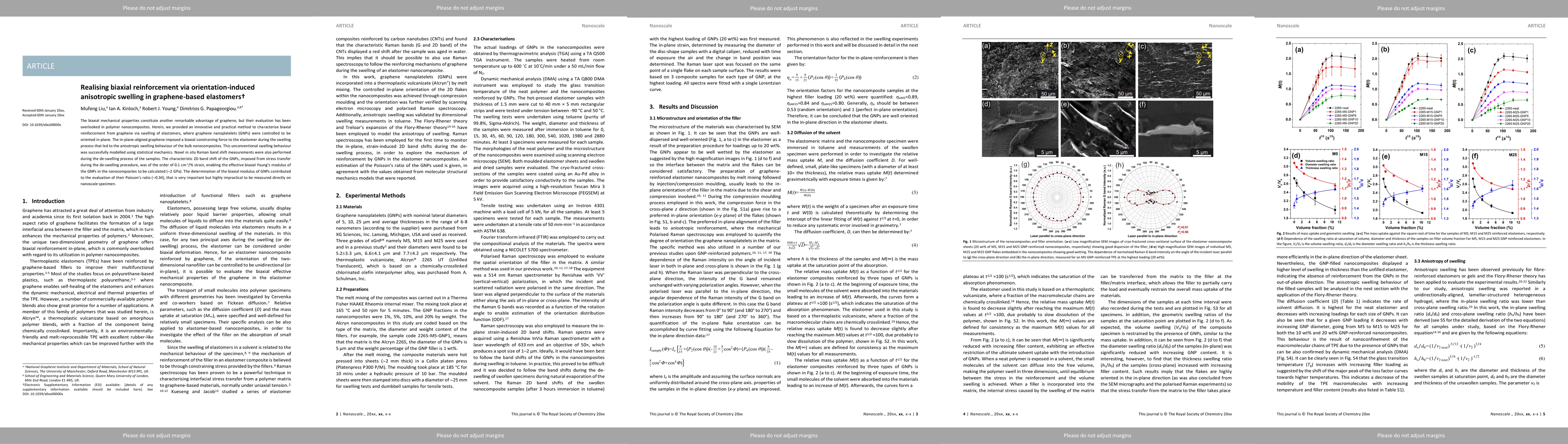 This paper presents a novel method for evaluating biaxial reinforcement in graphene-based elastomers through controlled orientation of graphene nanoplatelets, which induces anisotropic swelling and enhances mechanical properties. The in-plane alignment of graphene creates a biaxial constraining force during the swelling process, leading to improved biaxial mechanical properties.