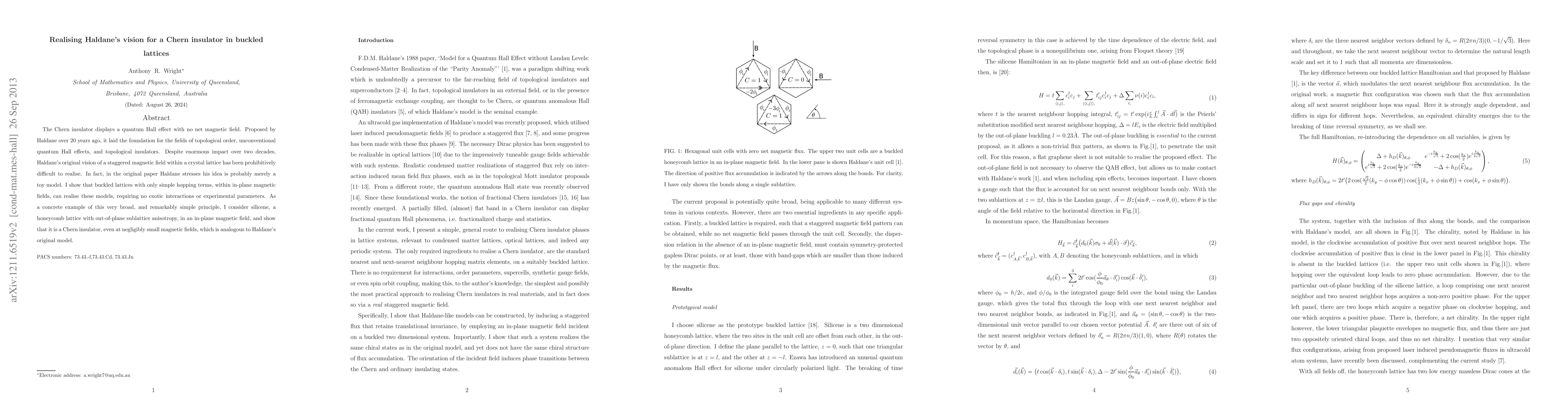 The Chern insulator displays a quantum Hall effect with no net magnetic field. Proposed by Haldane over 20 years ago, it laid the foundation for the fields of topological order, unconventional quantum Hall effects, and topological insulators. Despite enormous impact over two decades, Haldane's original vision of a staggered magnetic field within a crystal lattice has been prohibitively difficult to realise. In fact, in the original paper Haldane stresses his idea is probably merely a toy model. I show that buckled lattices with only simple hopping terms, within in-plane magnetic fields, can realise these models, requiring no exotic interactions or experimental parameters. As a concrete example of this very broad, and remarkably simple principle, I consider silicene, a honeycomb lattice with out-of-plane sublattice anisotropy, in an in-plane magnetic field, and show that it is a Chern insulator, even at negligibly small magnetic fields, which is analogous to Haldane's original model.