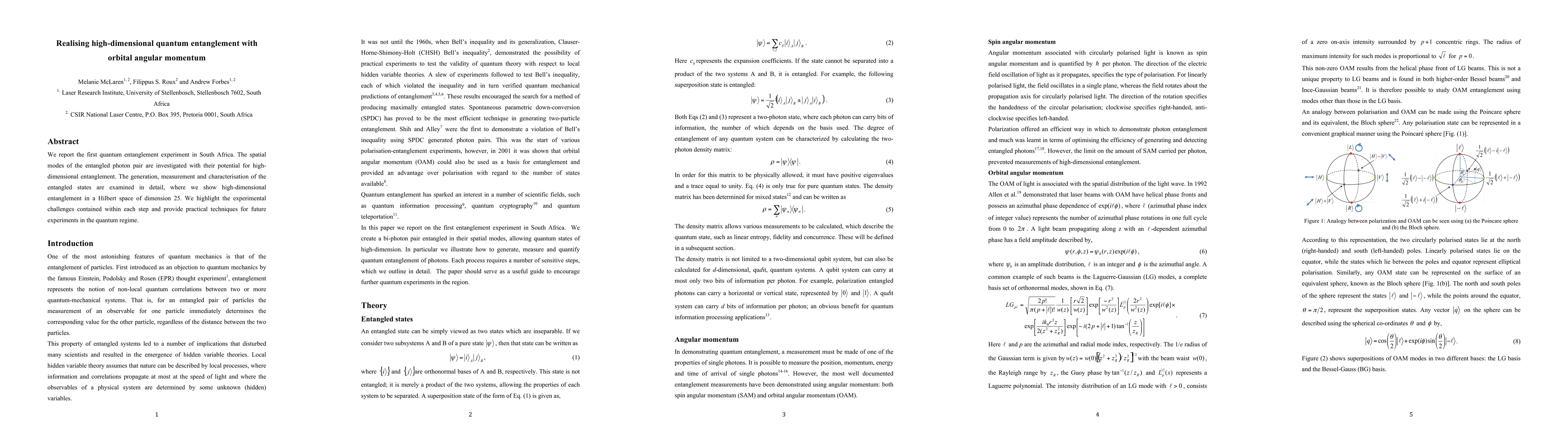 We report the first quantum entanglement experiment in South Africa. The spatial modes of the entangled photon pair are investigated with their potential for high-dimensional entanglement. The generation, measurement and characterisation of the entangled states are examined in detail, where we show high-dimensional entanglement in a Hilbert space of dimension 25. We highlight the experimental challenges contained within each step and provide practical techniques for future experiments in the quantum regime.