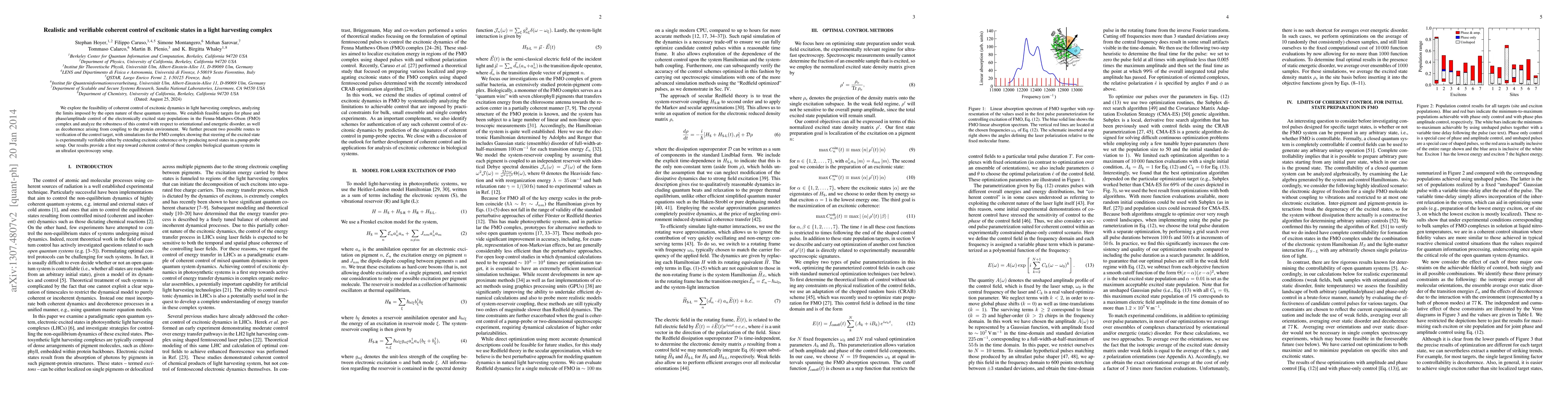 This paper investigates the potential for coherent control of excitonic dynamics in light-harvesting complexes, specifically the FMO complex, and assesses the feasibility of phase and amplitude control amidst environmental noise. It proposes two verification methods for this control and demonstrates that the control is experimentally verifiable through extended excitonic coherence or novel state production in a pump-probe setup.