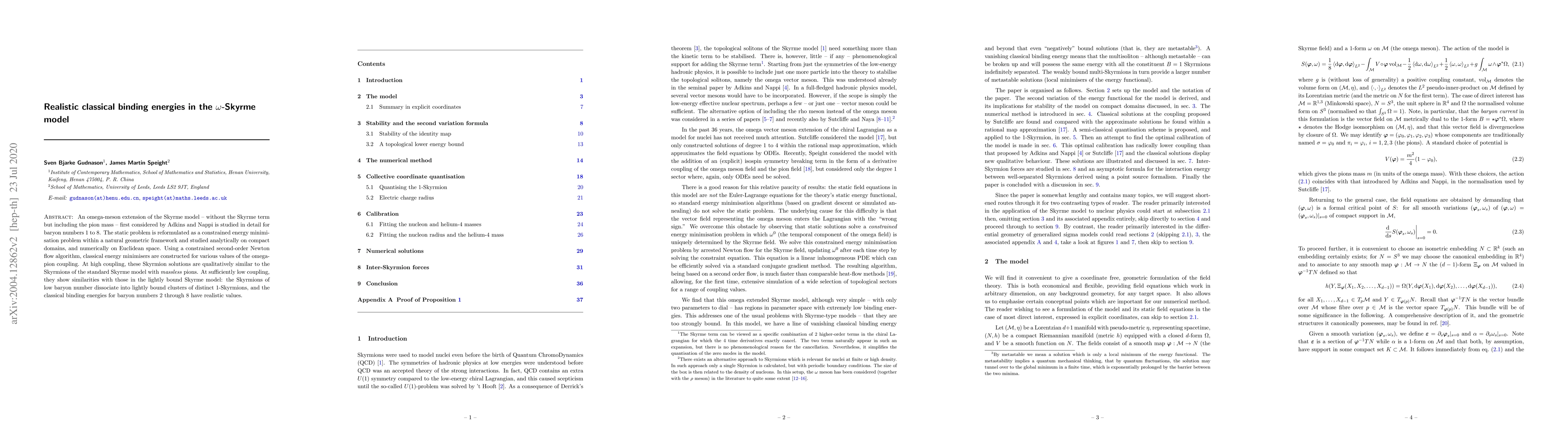 The paper presents a detailed analysis and numerical construction of classical Skyrmion solutions in the $\omega$-Skyrme model without the Skyrme term, using a geometric framework and advanced numerical methods.
