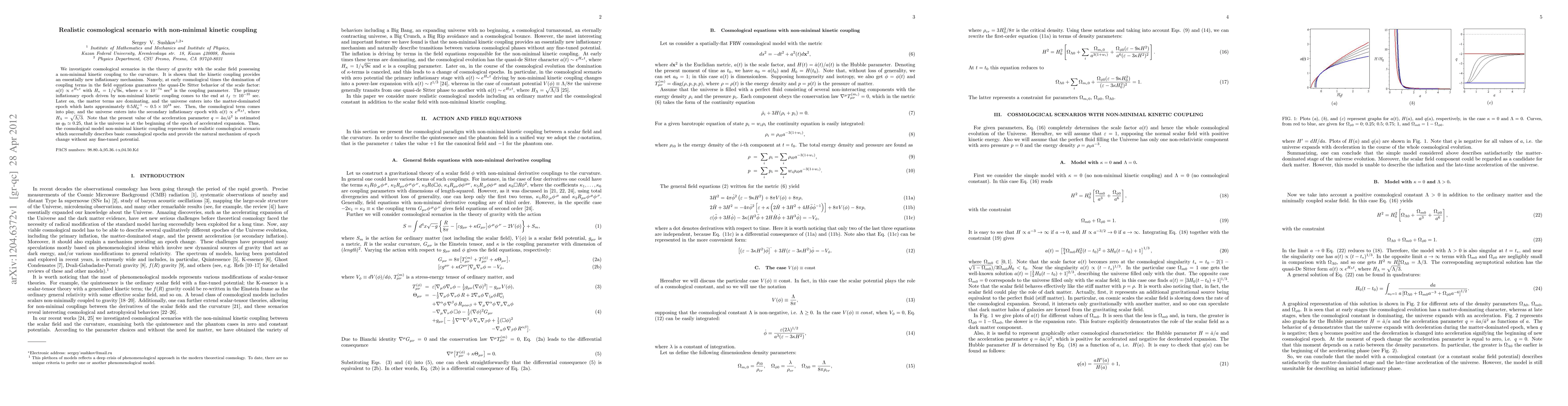 We investigate cosmological scenarios in the theory of gravity with the scalar field possessing a non-minimal kinetic coupling to the curvature. It is shown that the kinetic coupling provides an essentially new inflationary mechanism. Namely, at early cosmological times the domination of coupling terms in the field equations guarantees the quasi-De Sitter behavior of the scale factor: $a(t)\propto e^{H_{\kappa} t}$ with $H_\kappa=1/\sqrt{9\kappa}$, where $\kappa\simeq 10^{-74}$ sec$^2$ is the coupling parameter. The primary inflationary epoch driven by non-minimal kinetic coupling comes to the end at $t_f \simeq 10^{-35}$ sec. Later on, the matter terms are dominating, and the universe enters into the matter-dominated epoch which lasts approximately $0.5H_0^{-1}\sim 0.5\times10^{18}$ sec. Then, the cosmological term comes into play, and the universe enters into the secondary inflationary epoch with $a(t)\propto e^{H_{\Lambda} t}$, where $H_\Lambda=\sqrt{\Lambda/3}$. Note that the present value of the acceleration parameter $q=\ddot a a/\dot a^2$ is estimated as $q_0\simeq0.25$, that is the universe is at the beginning of the epoch of accelerated expansion. Thus, the cosmological model non-minimal kinetic coupling represents the realistic cosmological scenario which successfully describes basic cosmological epochs and provide the natural mechanism of epoch change without any fine-tuned potential.