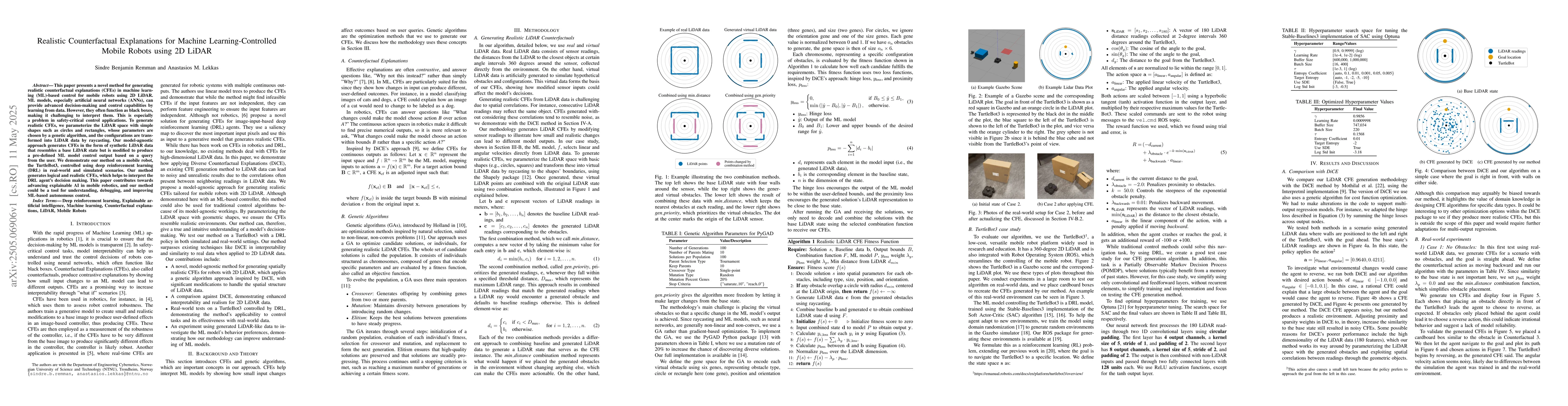 The research employs a model-agnostic approach to generate realistic counterfactual explanations (CFEs) for machine learning-controlled mobile robots using 2D LiDAR. It parameterizes LiDAR space with simple shapes like circles and rectangles, optimized by a genetic algorithm, and transforms configurations into LiDAR data via raycasting.