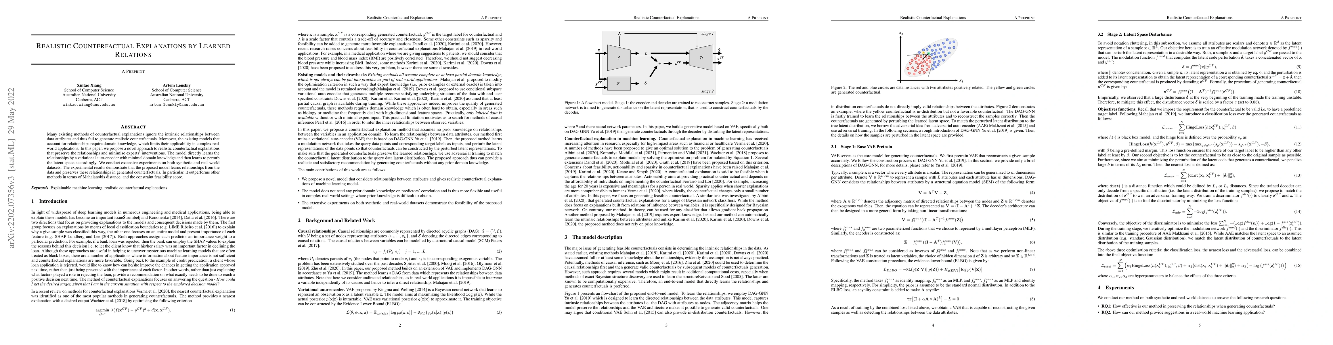 Many existing methods of counterfactual explanations ignore the intrinsic relationships between data attributes and thus fail to generate realistic counterfactuals. Moreover, the existing models that account for relationships require domain knowledge, which limits their applicability in complex real-world applications. In this paper, we propose a novel approach to realistic counterfactual explanations that preserve the relationships and minimise experts' interventions. The model directly learns the relationships by a variational auto-encoder with minimal domain knowledge and then learns to perturb the latent space accordingly. We conduct extensive experiments on both synthetic and real-world datasets. The experimental results demonstrate that the proposed model learns relationships from the data and preserves these relationships in generated counterfactuals. In particular, it outperforms other methods in terms of Mahalanobis distance, and the constraint feasibility score.