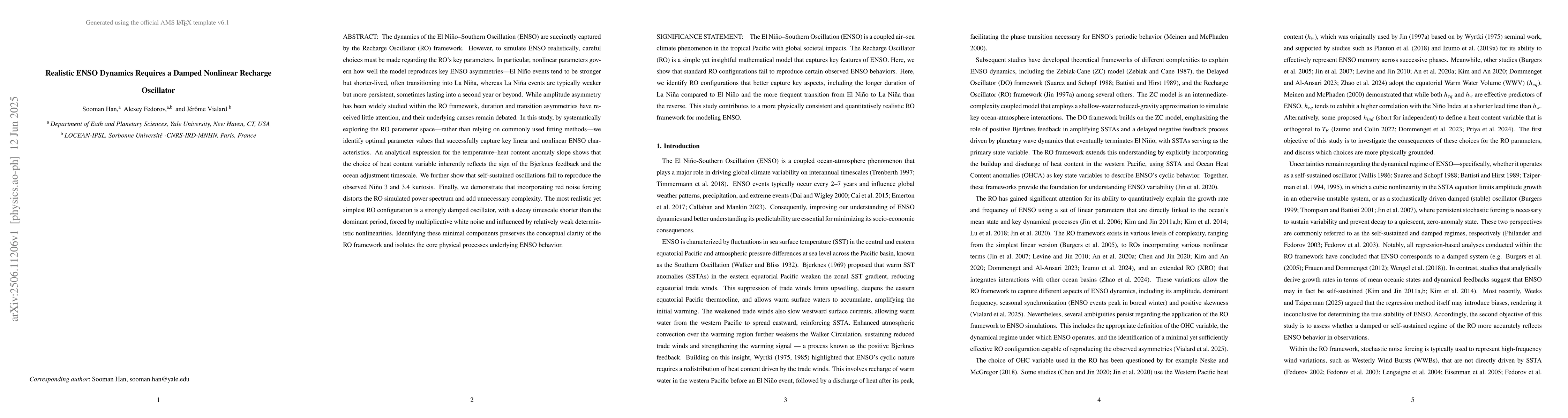 The dynamics of the El Ni\~no Southern Oscillation (ENSO) are succinctly captured by the Recharge Oscillator (RO) framework. However, to simulate ENSO realistically, careful choices must be made regarding the RO's key parameters. In particular, nonlinear parameters govern how well the model reproduces key ENSO asymmetries-El Ni\~no events tend to be stronger but shorter-lived, often transitioning into La Ni\~na, whereas La Ni\~na events are typically weaker but more persistent, sometimes lasting into a second year or beyond. While amplitude asymmetry has been widely studied within the RO framework, duration and transition asymmetries have received little attention, and their underlying causes remain debated. In this study, by systematically exploring the RO parameter space-rather than relying on commonly used fitting methods-we identify optimal parameter values that successfully capture key linear and nonlinear ENSO characteristics. An analytical expression for the temperature-heat content anomaly slope shows that the choice of heat content variable inherently reflects the sign of the Bjerknes feedback and the ocean adjustment timescale. We further show that self-sustained oscillations fail to reproduce the observed Nino 3 and 3.4 kurtosis. Finally, we demonstrate that incorporating red noise forcing distorts the RO simulated power spectrum and add unnecessary complexity. The most realistic yet simplest RO configuration is a strongly damped oscillator, with a decay timescale shorter than the dominant period, forced by multiplicative white noise and influenced by relatively weak deterministic nonlinearities. Identifying these minimal components preserves the conceptual clarity of the RO framework and isolates the core physical processes underlying ENSO behavior.