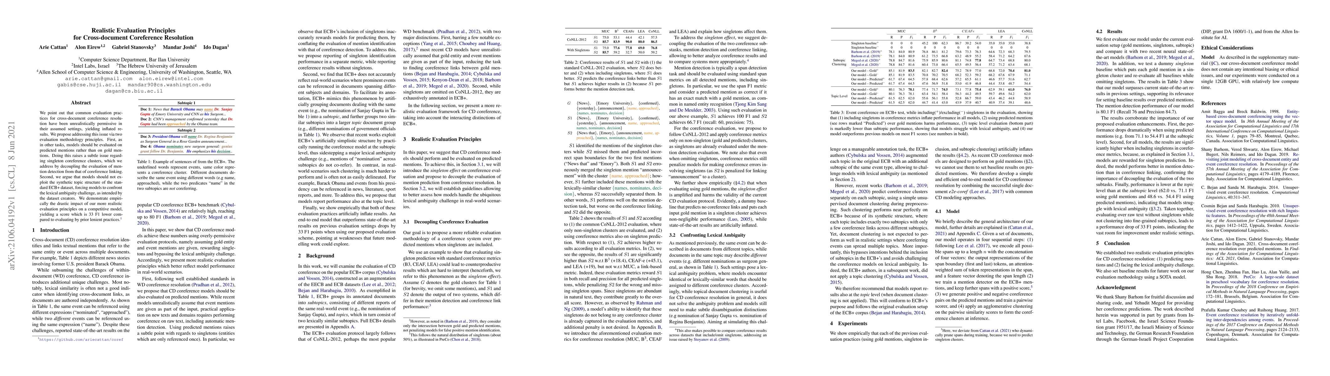 This paper critiques current evaluation practices for cross-document coreference resolution, arguing they are too lenient and inflate results. It proposes two new evaluation principles: evaluating models on predicted mentions and decoupling mention detection from coreference linking, while also discouraging the use of synthetic dataset structures to better test lexical ambiguity. Empirical results show a significant drop in performance when applying these principles.