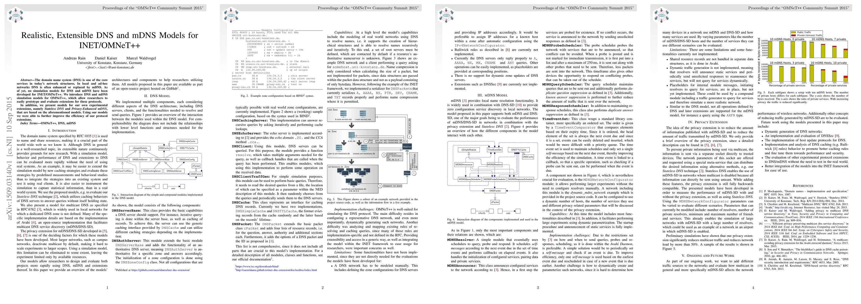 This paper introduces DNS and mDNS simulation models for INET/OMNeT++, enabling researchers to prototype and evaluate protocol extensions. It also presents models for the authors' extensions, Stateless DNS and Privacy-Enhanced mDNS, demonstrating improved efficiency through these models.