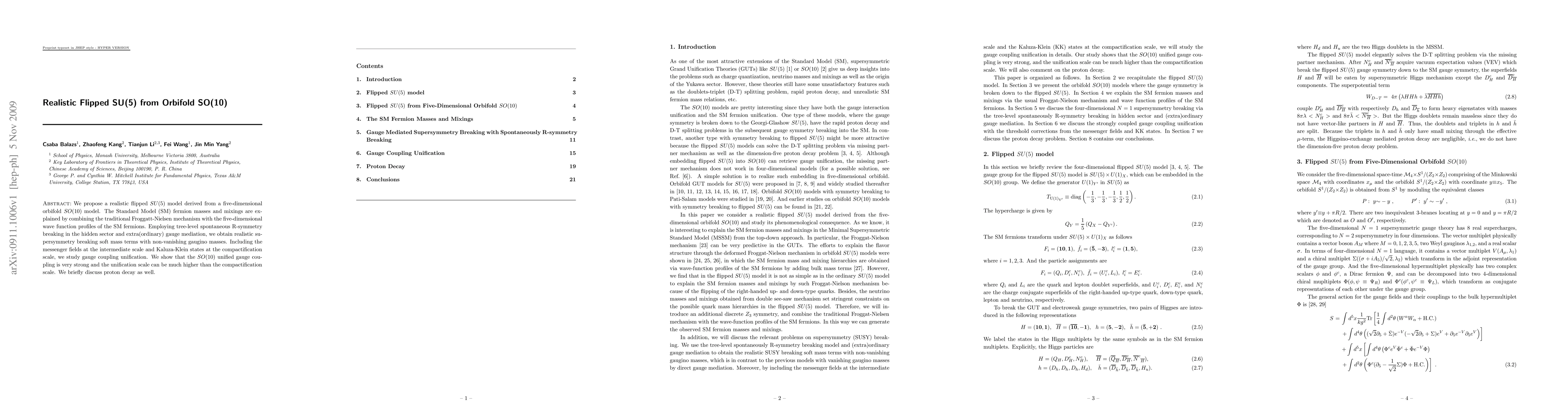 This paper proposes a realistic flipped SU(5) model originating from a five-dimensional orbifold SO(10) framework, explaining Standard Model fermion masses and mixings via the Froggatt-Nielsen mechanism and five-dimensional wave functions. It achieves realistic supersymmetry breaking soft masses through tree-level spontaneous R-symmetry breaking and gauge mediation, and studies gauge coupling unification, finding a strong SO(10) unified gauge coupling with a high unification scale.