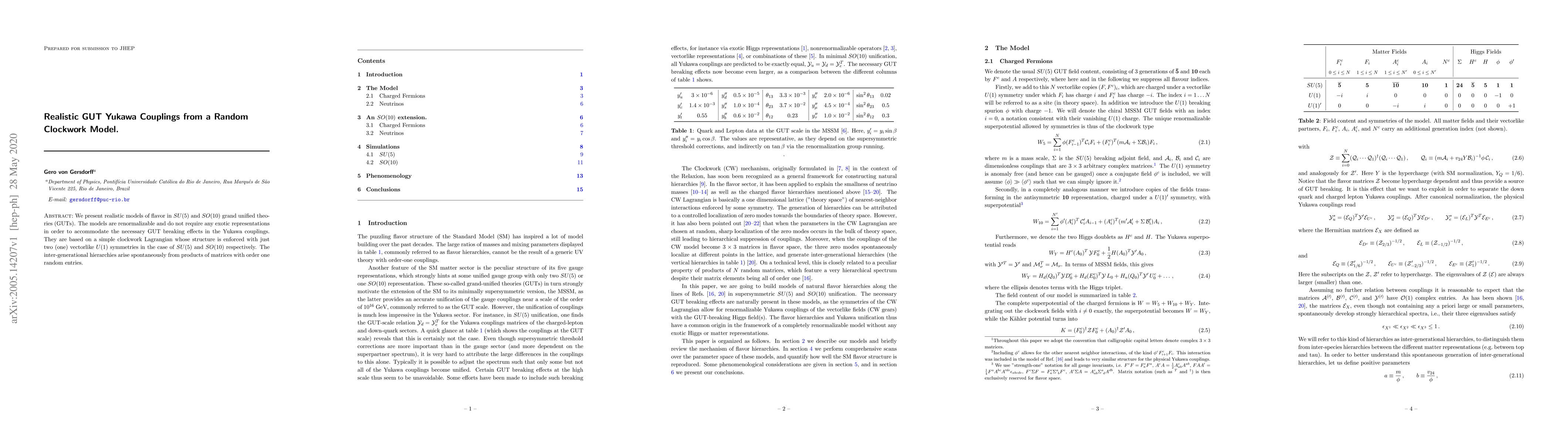 This paper proposes realistic flavor models in SU(5) and SO(10) GUTs using a clockwork Lagrangian, which naturally generates inter-generational hierarchies through random matrices without requiring exotic representations. The models achieve GUT breaking effects spontaneously.