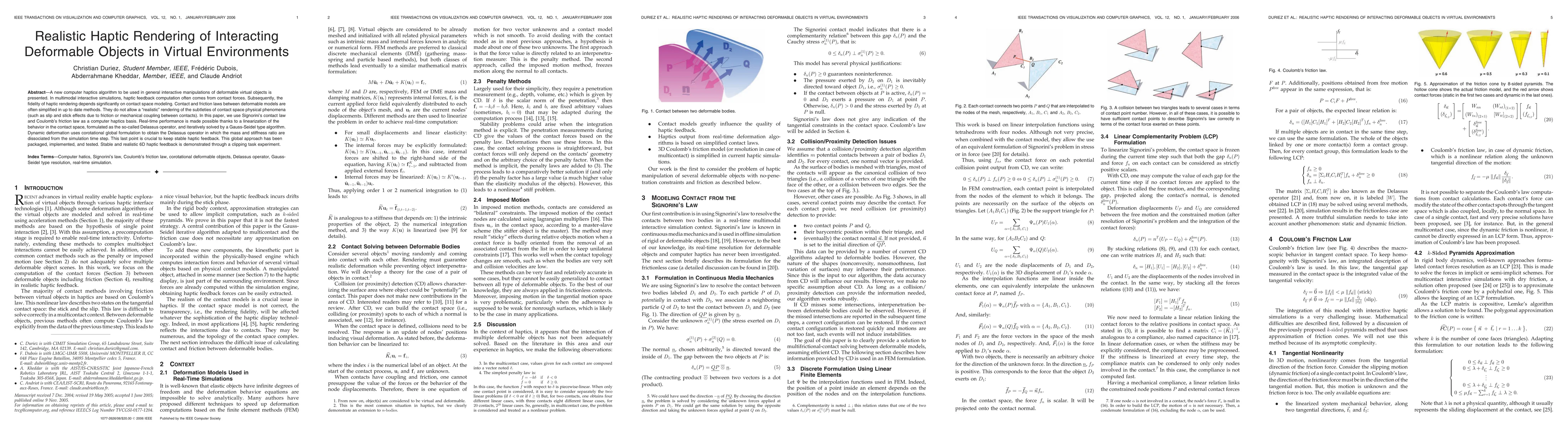 This paper presents a novel haptics algorithm for realistic interaction with deformable virtual objects, utilizing Signorini's and Coulomb's laws for accurate contact and friction modeling. The method employs a linearization technique and a Gauss-Seidel algorithm to achieve real-time performance and stable haptic feedback, demonstrated through a successful clipping task experiment.