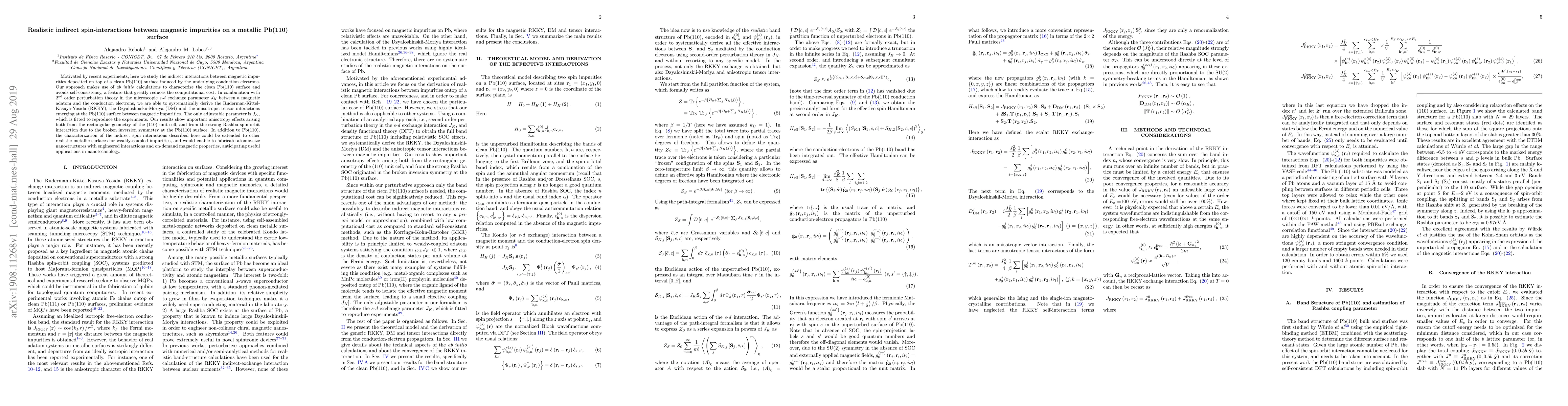 Motivated by recent experiments, here we study the indirect interactions between magnetic impurities deposited on top of a clean Pb(110) surface induced by the underlying conduction electrons. Our approach makes use of \textit{ab initio} calculations to characterize the clean Pb(110) surface and avoids self-consistency, a feature that greatly reduces the computational cost. In combination with 2$^{\text{nd}}$ order perturbation theory in the microscopic \textit{s-d} exchange parameter $J_{K}$ between a magnetic adatom and the conduction electrons, we are able to systematically derive the Ruderman-Kittel-Kasuya-Yosida (RKKY), the Dzyaloshinskii-Moriya (DM) and the anisotropic tensor interactions emerging at the Pb(110) surface between magnetic impurities. The only adjustable parameter is $J_{K}$, which is fitted to reproduce the experiments. Our results show important anisotropy effects arising both from the rectangular geometry of the (110) unit cell, and from the strong Rashba spin-orbit interaction due to the broken inversion symmetry at the Pb(110) surface. In addition to Pb(110), the characterization of the indirect spin interactions described here could be extended to other realistic metallic surfaces for weakly-coupled impurities, and would enable to fabricate atomic-size nanostructures with engineered interactions and on-demand magnetic properties, anticipating useful applications in nanotechnology.