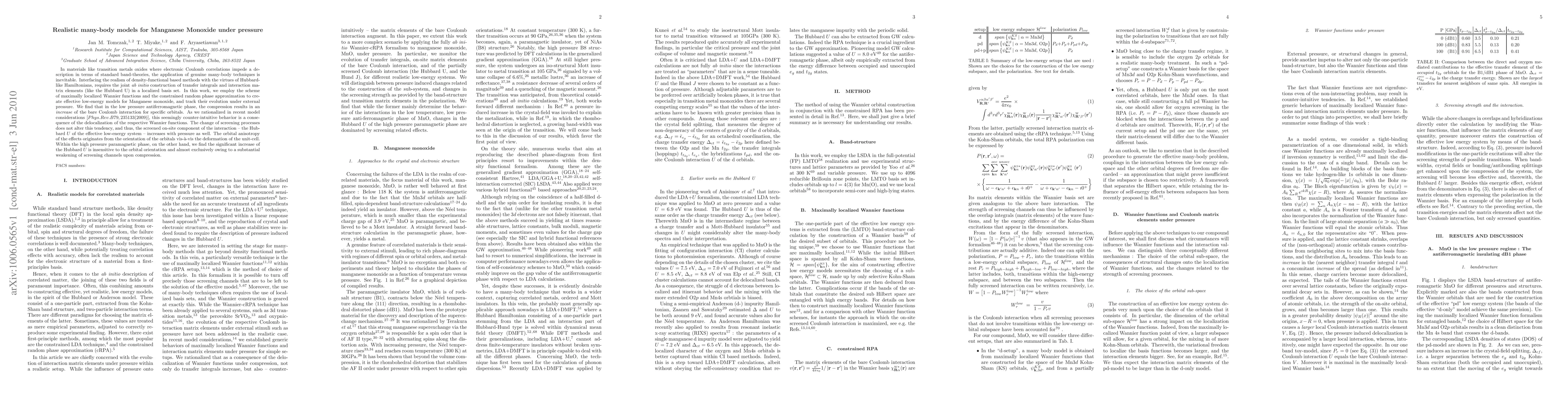 The study uses ab initio methods, specifically the constrained random phase approximation (cRPA) within a setup of maximally localized Wannier functions, to construct effective low-energy models for Manganese monoxide (MnO) under pressure. This approach allows for the joint consideration of realism from density-functional based methods and the advantages of Hubbard-like Hamiltonians in a localized basis set.