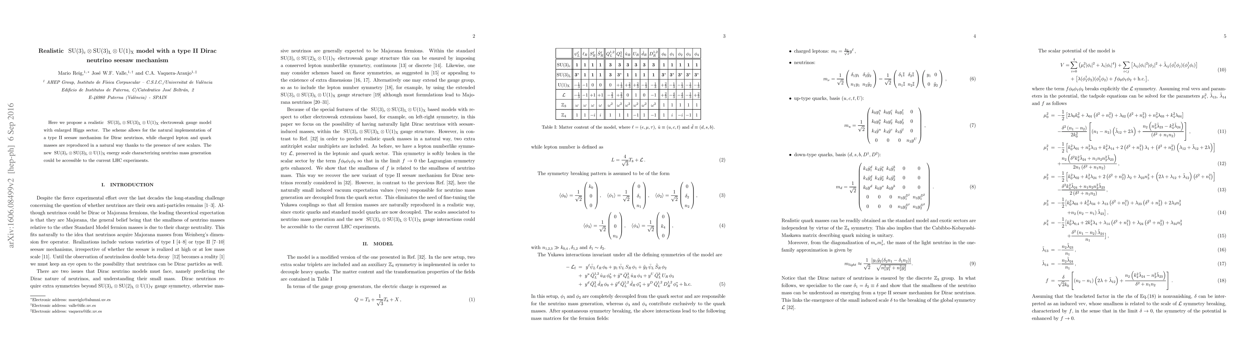 This paper proposes a realistic $\mathrm{SU(3)_c \otimes SU(3)_L \otimes U(1)_X}$ electroweak gauge model with an extended Higgs sector, enabling a type II seesaw mechanism for Dirac neutrinos and naturally generating charged lepton and quark masses through new scalars. The model's neutrino mass generation scale may be testable at current LHC experiments.