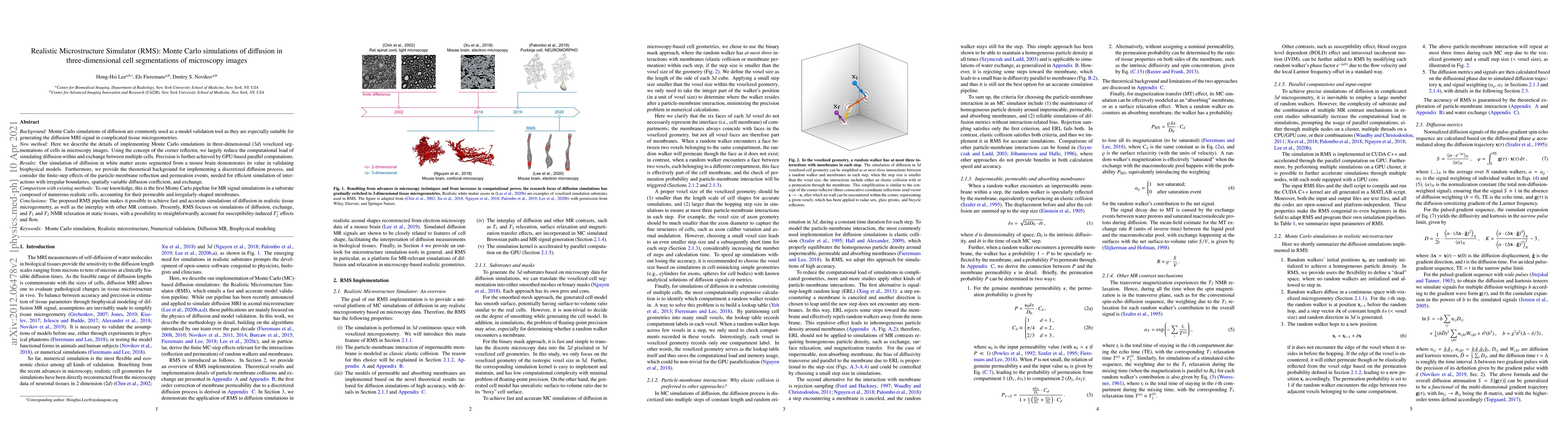 The Realistic Microstructure Simulator (RMS) introduces a novel Monte Carlo method for simulating diffusion in 3D cell segmentations from microscopy images, significantly reducing computational load using corner reflectors and GPU parallelization. The RMS pipeline validates biophysical models by simulating diffusion in mouse brain axons, offering a first-of-its-kind approach for MR signal simulations in complex tissue microgeometries.