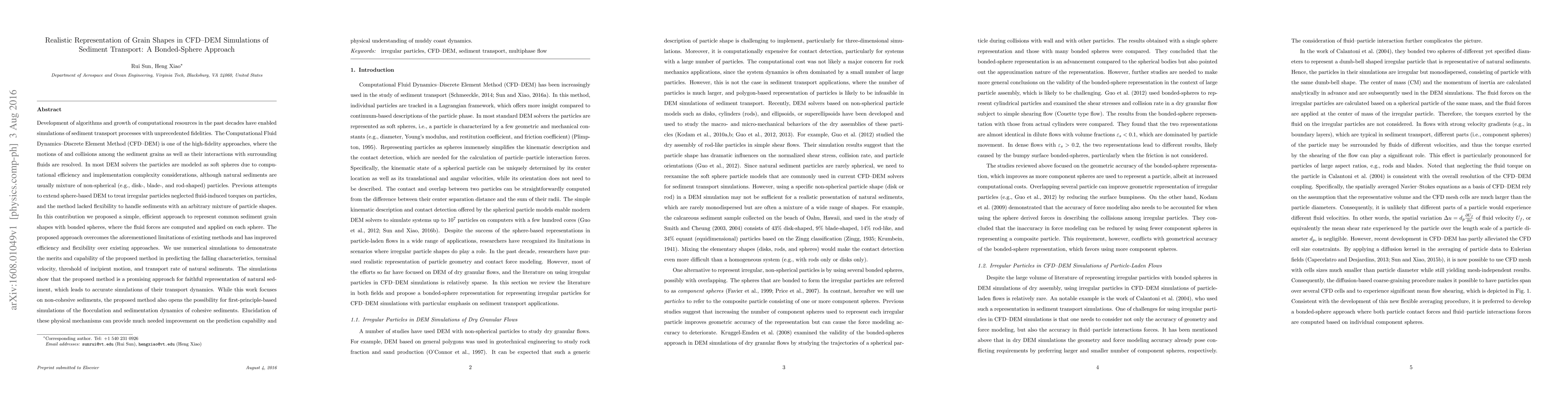 This paper proposes a bonded-sphere approach within CFD-DEM simulations to realistically represent non-spherical sediment grains, addressing limitations of previous sphere-based methods. The new method efficiently computes fluid forces on each sphere, improving accuracy in predicting sediment transport dynamics.