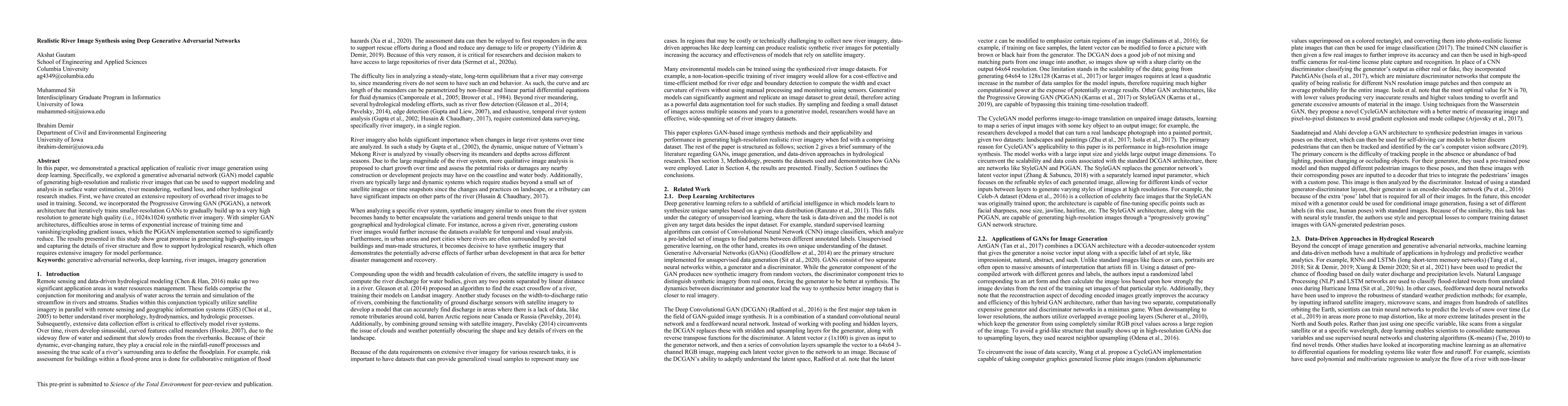 This paper presents a deep generative adversarial network (GAN) model using the Progressive Growing GAN (PGGAN) to generate high-resolution, realistic river images, aiding hydrological research. The study demonstrates the effectiveness of PGGAN in overcoming training challenges and producing detailed synthetic imagery for applications like surface water estimation and river analysis.