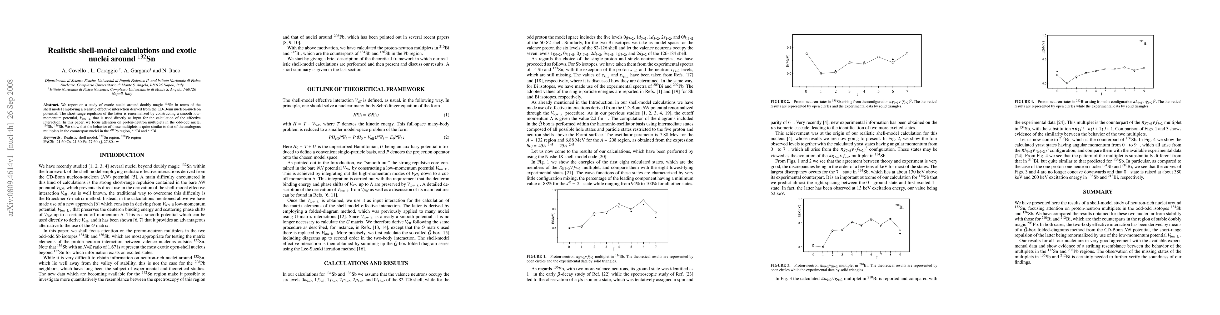 We report on a study of exotic nuclei around doubly magic 132Sn in terms of the shell model employing a realistic effective interaction derived from the CD-Bonn nucleon-nucleon potential. The short-range repulsion of the latter is renormalized by constructing a smooth low-momentum potential, V-low-k, that is used directly as input for the calculation of the effective interaction. In this paper, we focus attention on proton-neutron multiplets in the odd-odd nuclei 134Sb, 136Sb. We show that the behavior of these multiplets is quite similar to that of the analogous multiplets in the counterpart nuclei in the 208Pb region, 210Bi and 212Bi.
